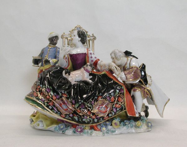 Editor: We’re looking at a mid-20th century ceramic sculpture called "Day of the Dead Group," which seems to be from Mexico or another part of Latin America, at the Minneapolis Institute of Art. It depicts two figures on a cart pulled by a red animal and strikes me as quite festive. What do you see in this piece? Curator: The imagery is layered, wouldn’t you say? Beyond the bright colours and folksy style. Consider the pairing of figures. We have what seems to be a man, maybe singing or shouting from the back of the cart. Up front we see what seems to be a figure, possibly dead, their skin mottled in white circles; notice their hat adorned with a pointed symbol. Think about the tension: life and death riding together. What might that symbolize, in the context of Day of the Dead traditions? Editor: It seems to echo the holiday’s focus of celebrating and remembering deceased loved ones, blurring the boundary between the living and spirit realms. Curator: Precisely. The pointed headgear hints at something potentially more ancestral and ceremonial, as headgear, especially elaborate pieces, mark position or roles. Now consider the animal pulling this peculiar duo - What is it? A Xoloitzcuintli perhaps? Do you see visual clues about the figure? Editor: With its pointy ears and decorated fur, it reminds me of some folk traditions connected to psychopomps or guides for the soul. Would that connect the piece with ideas of journeys and rites of passage? Curator: Very good! This humble ceramic, therefore, becomes more than decorative; it is charged with centuries of meaning woven into the rituals of remembering the dead and considering transitions from one state to another. Editor: It's amazing to think about how a simple sculpture can hold so much cultural significance. I had only noticed the colorful, bright presentation, but now I appreciate how it taps into deep symbolic territory!