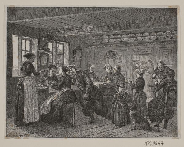 Winslow Homer made this illustration, "Thanksgiving Day - The Dinner" in 1858 for Harper's Weekly, using wood engraving on paper. The composition is divided into two distinct scenes, each framed within the larger page. In the upper panel, a formal dinner is depicted. The horizontal lines of the tables and the vertical lines of the figures create a structured, almost rigid setting. The contrast between light and shadow defines forms and adds depth. This structured arrangement speaks to the ritualized nature of dining. Below, the scene shifts dramatically. Figures are caught in dynamic poses as they dance. The lines here are curved and energetic, conveying movement. The use of chiaroscuro enhances the sense of liveliness and spontaneity. The shift from the structured meal to the fluid dance reflects a transition from formal duty to unrestrained enjoyment. Homer uses this visual dichotomy to explore themes of social order and individual expression. Together, the composition invites viewers to reflect on the structured and unstructured experiences that shape our lives.