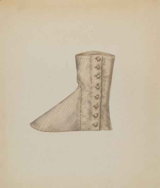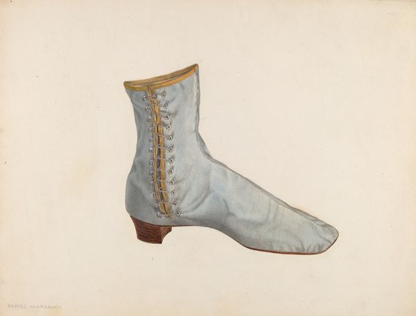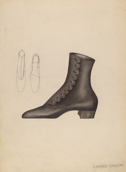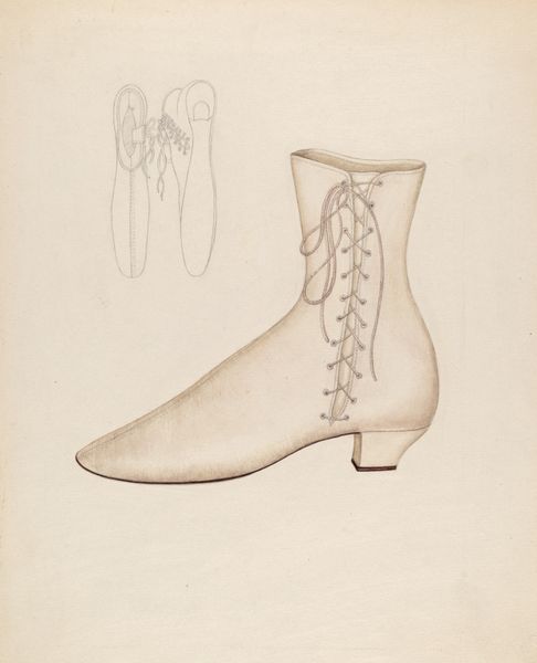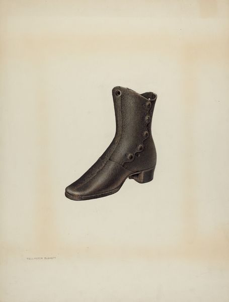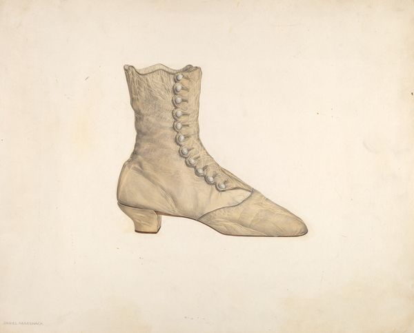 Editor: So, this is Arlington Gregg’s "Shoe," made around 1938 using watercolor and drawing techniques. It’s quite a simple image, just a single shoe depicted. It feels…ordinary, almost like an advertisement, but I wonder about the choice to isolate a single object. What jumps out at you when you look at this piece? Curator: Immediately, I'm drawn to the process. Consider the socio-economic context: it's 1938, during the tail end of the Great Depression. Labor, access to materials, and methods of production were undergoing massive shifts. To focus so intently on a single shoe, rendered with accessible mediums like watercolor and drawing, is quite telling. It asks us to consider the labor involved in its manufacture and repair, as well as its potential as an emblem of personal resilience in harsh circumstances. Editor: That’s a good point; focusing on materials as reflective of a time makes a lot of sense. Does the style, Realism, impact your view? Curator: Absolutely. Realism isn't just about representing something 'as it is.' It's about grounding art in everyday experience, often spotlighting objects and lives that might be otherwise overlooked or devalued. How might the material and cultural value of such a shoe changed between the time of its use and Gregg’s choosing to represent it this way? The buttons, for instance: are they the marks of skilled labor or a kind of superficial ornament? Editor: I didn’t think about the button detail; thanks. So it is an ordinary object representing ordinary people and labor of the era, shown with everyday media? Curator: Precisely. It blurs the line between 'high art' and a kind of material record. How much can an object, even rendered simply in watercolor, tell us about the cultural currents of its time? Editor: Thanks! That has shifted how I understand artistic subject matter as a record, both simple and significant. Curator: A beautiful artifact – and record – isn't it?
