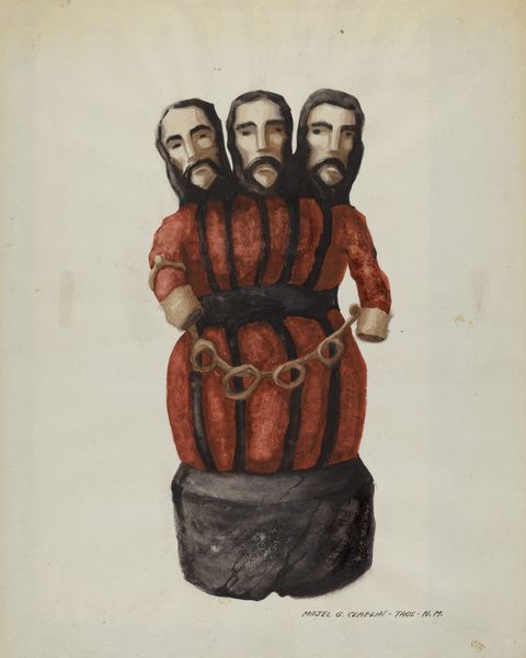 This Santo, by Ranka S. Woods, is a carved and painted wooden sculpture, a traditional form used in religious devotion. The choice of wood is significant; readily available, it’s a humble material worked with simple tools. Look at the way Woods has shaped the wood. The figures are blocky, not refined, and the paint is applied directly, with visible brushstrokes. This directness speaks to the maker’s hand, emphasizing process over polish. The three faces, bound by a chain, might represent the Holy Trinity or perhaps a more complex theological idea specific to Woods’s cultural context. The roughly worked surface and the unpretentious materials challenge any separation of folk art from “high art.” Instead, the sculpture invites us to consider the social function of religious imagery and the labor involved in its creation. Ultimately, the Santo’s power resides not in technical virtuosity, but in its capacity to embody faith through modest means.
