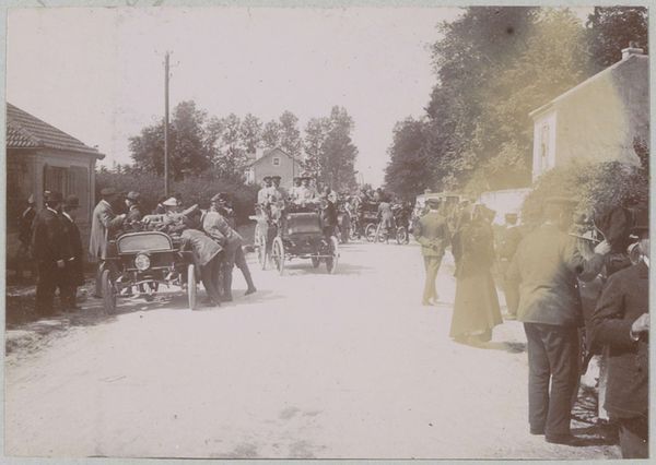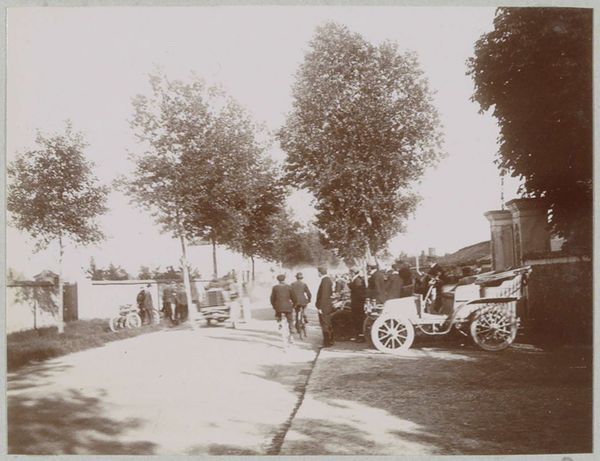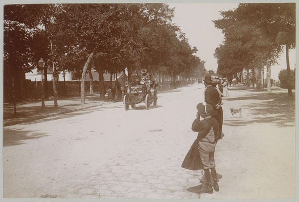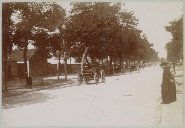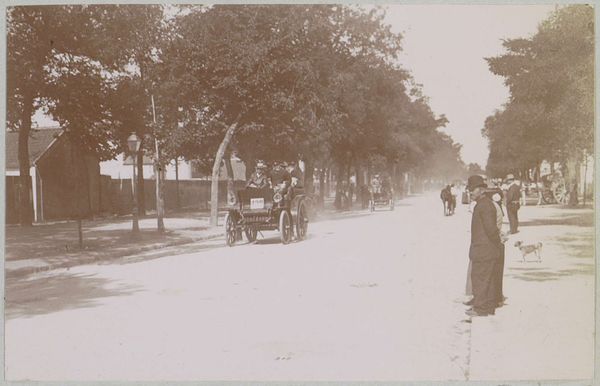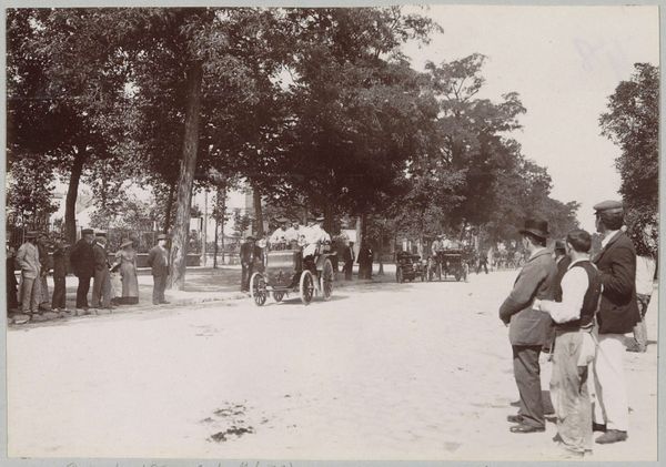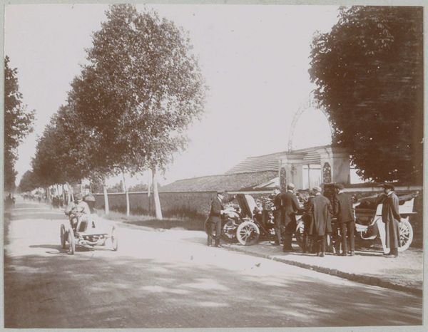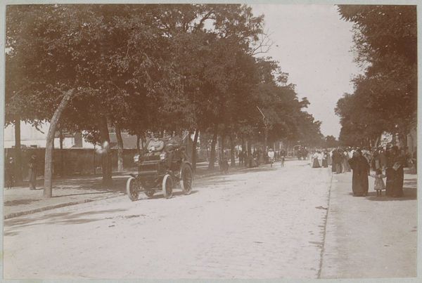 Editor: Here we have a photographic print titled "Start van de race Parijs-Amsterdam voor automobielen," believed to be from 1898. What strikes me is the contrast between the static, tree-lined street and the implied motion of the automobiles. What do you see in terms of composition and form? Curator: The sepia tone dominates, creating a somewhat uniform tonality across the surface. Note the linear perspective created by the receding street, countered by the vertical thrust of the trees lining the avenue. This interplay of horizontal and vertical lines provides a structured, almost architectural framework for the implied dynamism of the automobiles. How do you perceive the balance within this structured scene? Editor: I see what you mean. It's a staged chaos, maybe? The trees and buildings on the sides act as a frame, almost like theater curtains. Curator: Precisely. Observe how the light and shadow define the shapes of the vehicles and the surrounding figures. There is a deliberate focus on the vehicles themselves, their dark forms rendered against the lighter backdrop of the road, emphasizing their mechanical presence within the organic setting. Do you find that the textural contrast between the vehicles and the foliage creates any visual interest? Editor: Absolutely! The smooth, dark surfaces of the cars contrast strongly with the rough, detailed texture of the trees. It almost feels like a statement about technology versus nature. It is so fascinating to analyse it on that level. Thanks! Curator: Indeed, that friction enlivens this image. Close attention to these fundamental formal elements provides insights regardless of historical context or intent. These principles of line, shape, light, and texture guide us through visual art across time. Editor: I hadn’t thought about it that way before. Thinking about the contrasts helps clarify the composition of this image. Thanks for the insights!