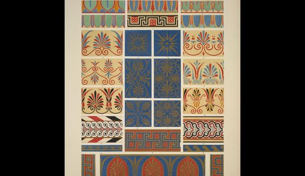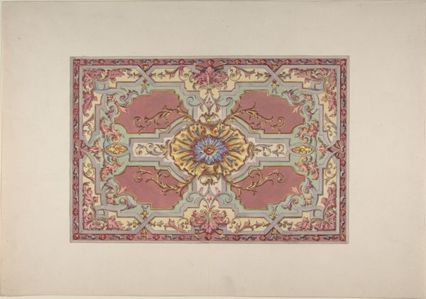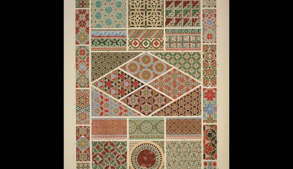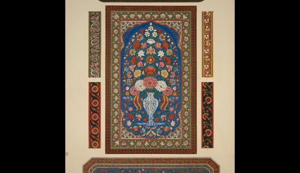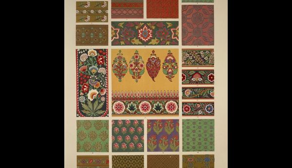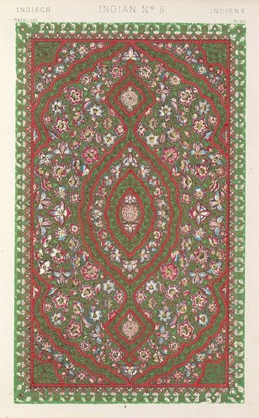 Owen Jones created this print, "Indian Ornament no. 5," as part of his study of painted lacquer work at the India-House. The artwork immediately strikes us with its intricate detail and symmetry. Dominated by a rich, earthy green, the central pattern is framed by borders of deep reds, blues and greens, creating a harmonious, almost musical composition. Jones here provides us not with a direct copy, but with a study of the underlying design principles. His formalism echoes a broader 19th-century interest in understanding global artistic traditions through the lens of design theory. Note how Jones uses a limited palette to achieve a sense of unity and visual balance. The recurring floral motifs and the geometric framework that contains them speak to a structural approach, where the ornament is understood as a system of signs governed by rules of repetition, variation, and symmetry. Jones, in his deep dive into Indian ornament, invites us to see design as more than just decoration; it is a structured language.