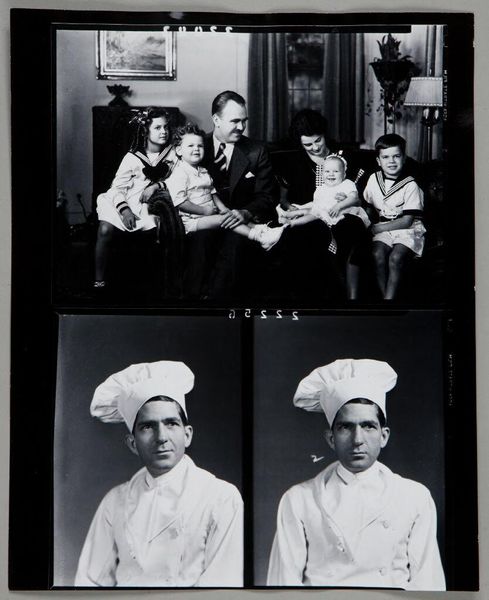 Editor: This is an untitled photographic print by Martin Schweig, showing two images: a large family portrait, and then two portraits of babies. What strikes me is the contrast between the posed formality of the family and the more candid, almost playful, images of the children. What do you see in this piece? Curator: I see a fascinating commentary on social roles and expectations within the family structure. Look at the rigid hierarchy in the group portrait—the elders centered, everyone carefully positioned. Then, consider the babies, their images almost mirror images and turned upside down, perhaps suggesting a disruption of that established order. What does this contrast tell us about Schweig's view of family and identity? Editor: So you’re saying the artist might be using the babies to question those rigid family roles? I hadn’t considered that. Curator: Precisely. It prompts us to consider how ideas of family have been historically constructed, and whose voices are centered or marginalized within them. Editor: That is very interesting! I learned a lot today.
