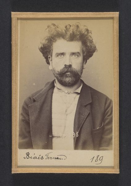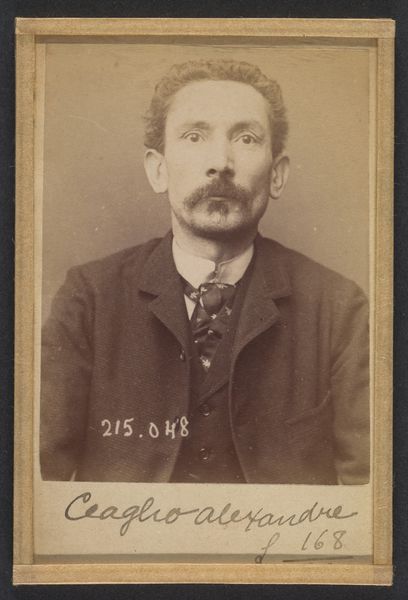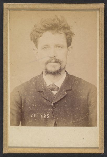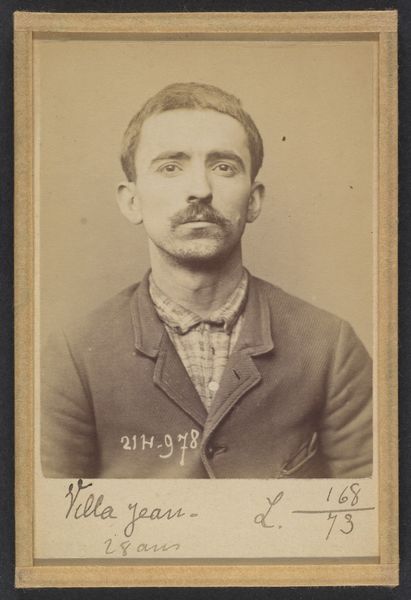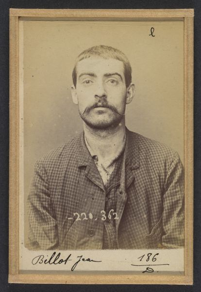 Editor: Here we have a gelatin-silver print from 1894 by Alphonse Bertillon, entitled "Carraglia. Charles. 39 ans, né à Moceto (It). Homme de lettres. Anar, infraction à la loi du 21/6/73. 13/3/94." It’s striking how this formal photographic style, normally reserved for portraits, is applied here; there's a haunting stillness. What strikes you most about this image? Curator: Well, for me, it's the palpable weight of history clinging to the man's gaze, isn't it? I mean, here's Carraglia, not just a name and a face, but a life tangled in the sociopolitical threads of 19th-century Europe. Anarchist, man of letters...it conjures images of smoky cafes, manifestos scribbled on napkins, perhaps even whispered conspiracies. Editor: So you see the photo as a gateway to a larger narrative? Curator: Absolutely! Bertillon's mugshots, see, they’re so much more than criminal records. They become accidental archives of defiance, revealing how the establishment chose to document and, in effect, silence dissident voices. And there's something quietly subversive about framing Carraglia within the established codes of portraiture – like displaying a captured revolutionary as a prize, almost. Does it not strike you? Editor: I hadn't considered it quite that way. I was focusing on the individual; the details like the slight wear in his clothes and wondering about the law he broke. Curator: And isn’t that the beauty of art? We both see it differently and we learn something new by having our own conversation about what we saw. Editor: Definitely. I see it with fresher eyes now. Thanks!