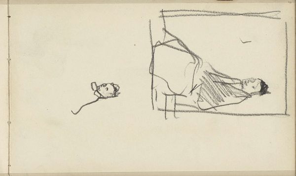 Curator: Here we have Max Beckmann's pencil drawing, titled "Parklandschaft (Cat Sleeping behind Bars) [p. 58]". It looks to be a page torn straight from a sketchbook. Editor: My first impression is…claustrophobia. Despite the title including "Parklandschaft", or park landscape, those horizontal lines create a palpable sense of confinement. A landscape observed through a cage, almost. Curator: Indeed. You know, looking closer, the immediacy of the pencil strokes gives me a glimpse into Beckmann's process. You can practically feel him sketching rapidly, capturing a fleeting moment. It's raw and unfiltered, wouldn't you say? A window into his working mind, if you will. Editor: Absolutely. Note the very particular nature of the paper; that visible tooth gives so much visual information about its material existence as an object of consumption – like, did Beckmann buy it himself? Was it mass-produced or individually laid? All the answers change our understanding of the work. And the very conscious application of line here does challenge our ideas about value within “high art”. Curator: I wonder what drew him to this particular scene? What's so interesting in a sleeping cat, that merits capture between landscapes? Was he perhaps drawing a parallel between domesticity and imprisonment? Or could it be a musing on the restriction of artists, like the caged domestic animal of his sketch? Editor: And let's not forget, Beckmann's work often dealt with the anxieties of the interwar period. The "bars" here could signify the restrictions imposed by society or even his own inner turmoil during a time of unprecedented industrial material growth. What constraints, after all, does society bring to artistic endeavors and freedoms? Curator: That's a rather bleak way of thinking about it. But I do see what you are driving at. He takes such a commonplace scene, but with such line control, and suggests deeper layers beneath a seemingly normal moment. So what appears straightforward, and perhaps mundane, in reality hints at an unease. Editor: It does add another layer of complexity to Beckmann’s wider body of work and how pencil, paper, and socioeconomics all blend! It's an interesting snapshot of his time and of how one uses the art of making do with such quotidian elements, no? Curator: Yes, absolutely. Looking again, what truly speaks to me is the simplicity in form alongside these complexities, born out of observation; the freedom felt through such raw creation is rather beautiful to behold. Editor: For me it is precisely about labor. Every work by Beckmann becomes a quiet manifesto. It is about what we produce with the society that produces us as both materials and subjects.