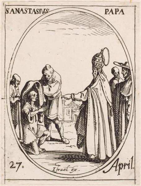 Curator: Looking at this print, it appears quite subdued and formal, almost austere in its presentation. Editor: Indeed. Here we have "Deel van de optocht, nr. 4," or "Part of the Parade, no. 4," an engraving by Joannes van (I) Doetechum dating back to between 1559 and 1619. Currently, it resides here at the Rijksmuseum. It provides insight into how public figures chose to represent themselves and their authority in print, intended for wide circulation. Curator: What immediately grabs my attention is the labor involved in creating the textures, particularly in rendering the fabrics and the heraldic emblems. Look at the intricacy of the lines to convey the different materials! There's a deliberate contrast between the heavy, dark folds of the robes and the more delicate details in the helmet plume and the banners. Editor: Yes, these prints functioned as a form of social and political currency. Displaying family crests, finery, and generally embedding status into the figures was extremely important, serving both as a commemorative and aspirational function. Curator: Exactly. Think about the social context of printmaking at that time. Engravings such as these allowed for the dissemination of specific visual messaging and also involved the engravers who became essential mediators, possessing specific skillsets. The engraver essentially determined how events were preserved for posterity, manipulating light and texture according to certain printing techniques to communicate prestige. Editor: And these images didn’t exist in a vacuum. They often reflected specific historical events or political agendas. Consider the function of public display and how prints, more so than paintings, facilitated an understanding—or indeed, a *controlled* understanding—of social hierarchy within the public imagination. It becomes a question of visibility and access, too. Who had the privilege of representation and who was actively excluded or marginalized? Curator: It prompts us to really think about how power and representation were manufactured, quite literally, in the early modern period through such works, doesn't it? Editor: It certainly does. Thank you for guiding us through the details and materiality within the history depicted here, very thought-provoking.