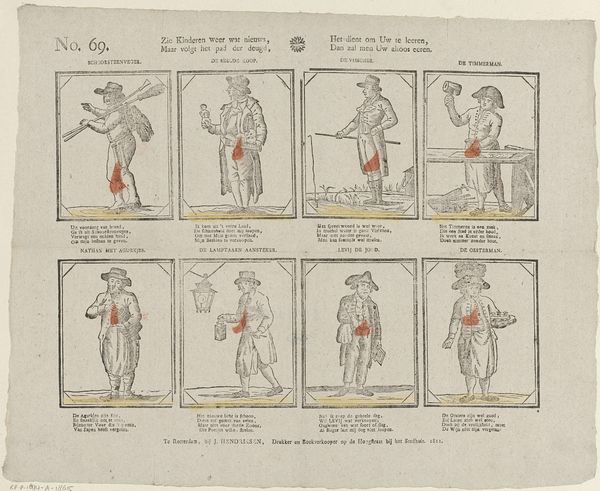 Curator: What strikes me first is how neatly compartmentalized the composition is. The piece features rows and columns of miniature figures, each a study in uniform and posture. Editor: Today we’re looking at an engraving from between 1814 and 1848 by Johannis Waleson. Its full title is quite a mouthful: “Deez' print vertoont u, lieve jeugd! / Een aantal helden, die hun leven, / Geld het de eer van 't land, met vreugd / En heldenmoed, ten besten geven”. The medium, engraving using ink, speaks to a certain method of artistic production that prioritizes reproducibility. The subject and technique are tightly bound. Curator: Absolutely, and those uniforms aren't just decoration; they represent a vast military-industrial complex. Think about the tailoring, the sourcing of materials, the workshops churning these out. The whole endeavor represents immense collective effort, the social hierarchies crystalized in textile and brass. Editor: While that social commentary is vital, can we appreciate the lines themselves? Notice how economical Waleson's marks are—how much information he conveys with such simple hatching and contour. The composition's rhythm draws you in. Curator: But isn’t that "rhythm" simply a reflection of the regimentation the work celebrates? I see a carefully calibrated system meant to normalize military service for its audience, the “lieve jeugd,” mentioned in the title. The material and purpose are of one piece. Editor: Even so, consider how the artist uses the limited vocabulary of engraving—the crispness of line, the tonal range he coaxes from it, how these elevate an essentially commercial piece towards a level of art. Curator: For me, those seemingly neutral formal elements are precisely what make the piece such an effective tool. Their precision communicates order, discipline, the virtues most prized by a society built on hierarchical power dynamics. Editor: It's clear, looking at the construction of this print, that even what feels purely formal is deeply intertwined with socio-political structures. But perhaps our debate will make listeners see, and maybe reconsider, this seemingly simple work of art. Curator: Yes, maybe they will consider the labor and purpose behind these historical images.
