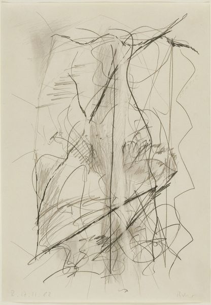 Eve Aschheim created "Split Infinitive" using charcoal and paint on paper, a combination of dry and wet media that allows for both precision and expressive gesture. Look closely and you'll see how the stark contrast of black and white defines the composition, and how the charcoal sketches create a foundation of nuanced grays, adding depth and texture. The artist's hand is evident in every line, each stroke a deliberate act of construction and deconstruction. The application of paint over charcoal creates an interesting dynamic. The push and pull of the materials—one linear and the other planar—adds to the spatial ambiguity of the work. This ambiguity in turn underscores the significance of process, reminding us that meaning emerges not just from the image itself, but from the artist's intimate engagement with her materials. This work challenges traditional distinctions between drawing and painting, and invites us to appreciate the interplay of intention and accident.