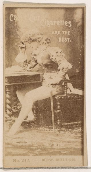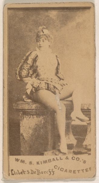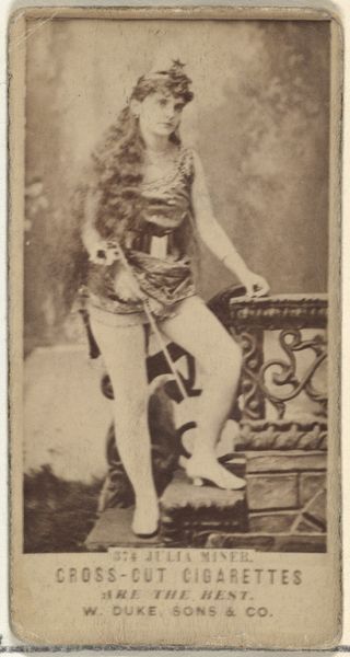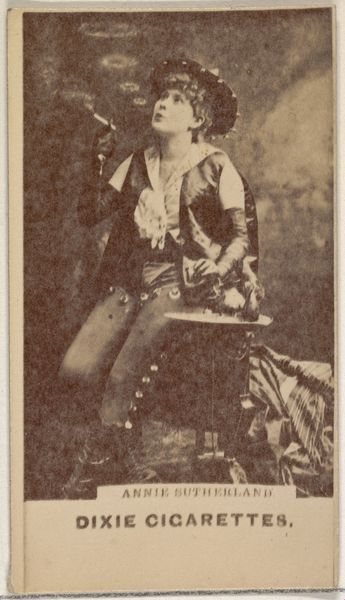 Curator: Alright, let's dive into this photograph of Mabel Miers. It's part of the "Actors and Actresses" series put out by Allen & Ginter for Virginia Brights Cigarettes sometime between 1885 and 1891. You get a glimpse of a popular actress in a marketing gimmick for a cigarette brand! What strikes you about it right off the bat? Editor: Immediately, I see a pronounced tension between the informality of the pose and the structured elements within the frame. The asymmetrical balance, created by her leaning figure and offset backdrop, presents a deliberate visual puzzle. It's provocative, self-possessed…dare I say, faintly absurd? Curator: Oh, I like that: absurd! It makes you wonder about the performative aspect, doesn’t it? She’s both Mabel Miers and this manufactured persona, all wrapped up in selling cigarettes. What’s "real," what’s constructed? Editor: Precisely. Observe how the sepia tones drain the photograph of a clear emotional tenor, forcing an objective viewing of compositional components, line, and texture. Semiotically, the cigarette card operates as a sign, encoding commercial intent with cultural representation. Her distinct costume creates conflicting textures. This suggests a reading of visual stratification… Curator: Woah there! Sometimes, it's as simple as a striking image folks are meant to keep, to remember, or trade with their pals. Beyond all the symbolism, the textures give it an intimacy... Almost feels like holding a memory. Editor: That haptic connection is a compelling facet. I’d counter, suggesting that emotional entry serves as a carefully designed rhetorical strategy—softening potential critical readings while driving mnemonic attachment to the Virginia Brights brand. Curator: See, I think it's okay for art to also be a simple joy or keepsake. She's almost defiant, the pose makes me wonder about how women in that era viewed their place. She's like, "Here I am, deal with it," you know? Editor: Your emphasis on emotionality highlights a pivotal dialectic. To engage with it beyond the level of immediate impact involves, for me, embracing the layers. Whether one seeks the "truth" of the image or appreciates its cultural operation is, ultimately, reader-dependent. Curator: It's definitely both for me: the feeling *and* the "layers" are vital and really inform the overall meaning. Let’s keep searching, keep looking, keep feeling, that’s where the real conversations always ignite!