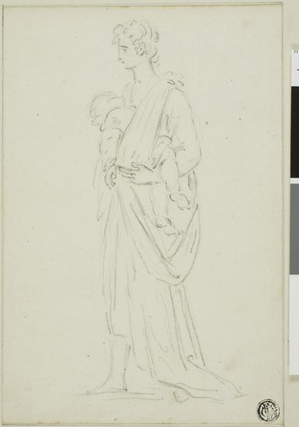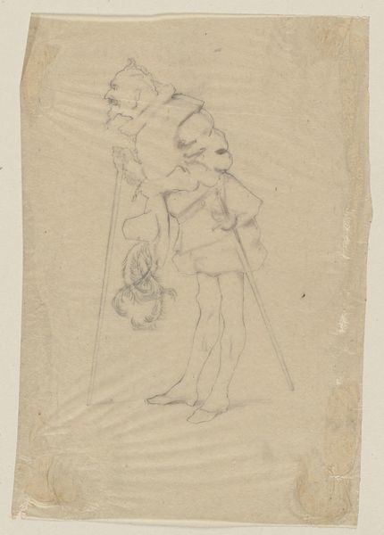 Curator: This is Studienblatt_ Männliche Kostümfigur sowie Handstudien by Josef Ferdinand Becker. The piece, currently held at the Städel Museum, is a 19th-century pencil drawing on paper. Editor: It's quite subtle. Almost ghostly in its rendering. The pale figure emerging from the paper creates an interesting tension between presence and absence. Curator: Exactly. The figure's nudity, coupled with the loose robe, creates an air of vulnerability and a kind of raw humanness, contrasting with what we might expect from "academic art". Consider the historical and cultural expectations of how the male body was presented then. Editor: I’m intrigued by the almost hesitant quality of the lines. This wasn’t intended as a finished work. It lacks a sense of immediacy, that decisive line we see in master draftsmen; it feels almost contemplative. The hand studies hint at the artistic process itself – capturing movement and expression. It speaks volumes about the discipline of training. Curator: And I'm fascinated by how it reflects a tradition – one steeped in symbol, classicism and mythic representation - and then filters all of that through the artist’s particular understanding. There's the conscious choice of how much to reveal, which carries meaning itself. Why leave a form unfinished? It asks the viewer to complete it. Editor: Good point. This would have been at a time of significant cultural shift; social mores and art academies shaping what was, and was not, presented to the public. One wonders where and how this particular work fits. Curator: Absolutely. In a museum context like this, its private, preparatory nature grants an unexpected insight into artistic creation. The museum essentially recontextualizes it as worthy of study in itself, altering how we understand these visual artifacts. Editor: Yes, and our interpretation reflects our contemporary values and understanding of beauty and artistic process. We give new meaning to these marks. Curator: A fascinating thought, bringing us full circle! The image absorbs our perspectives just as it embodies its own history. Editor: Indeed. It's an engaging reminder of art's capacity to exist both within and beyond its own time.