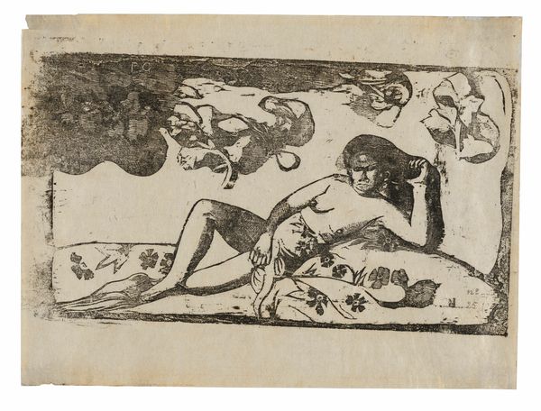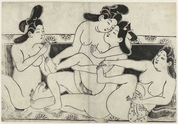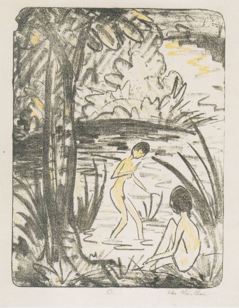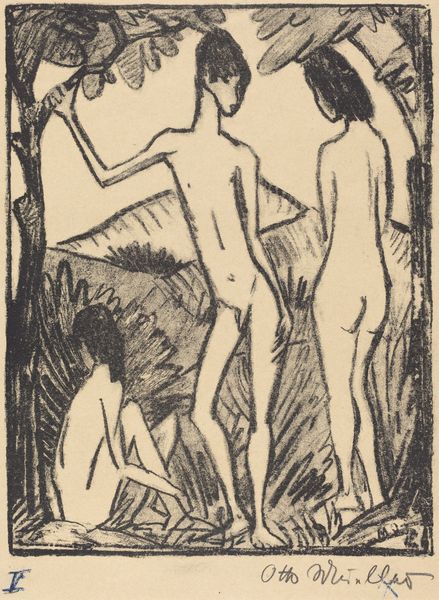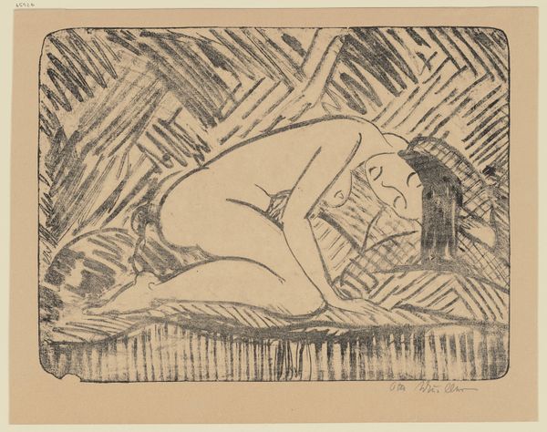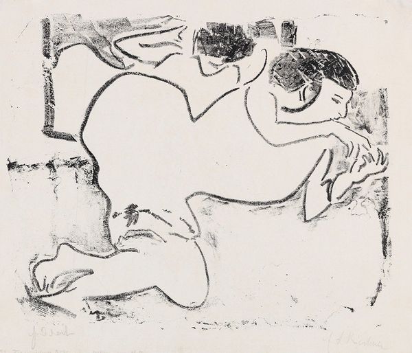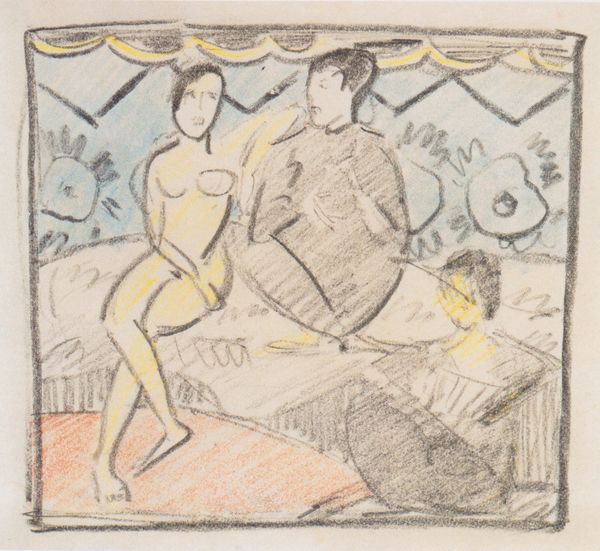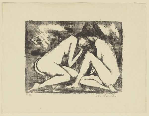 Editor: So, this is "Two Seated Girls with Necklace," an ink and pencil drawing by Otto Mueller from 1912. I'm struck by the sketchiness, how immediate and vulnerable the figures feel. It's definitely giving me "intimate glimpse" vibes, but I am also interested in how to interpret the contrast between the softer figures and harsher angular marks around them. What do you see in this piece, and can you contextualize the piece a bit further? Curator: Ah, yes, it whispers secrets, doesn't it? It feels intensely personal, a little voyeuristic even. For me, it's about capturing fleeting moments. Otto Mueller, as part of Die Brücke, sought authenticity. The rawness, the unfinished quality... it's all intentional, rejecting academic polish. I always wonder what sort of relationship is on display, here. Is it friendship, perhaps an awakening to sensuality? The necklace is such an interesting and simple item that hints at femininity or even domesticity. The seemingly chaotic marks, are they enclosure? Or are they simply an abandonment of any classical or romantic pretense? It feels as though it resists our gaze, doesn't it? Editor: It definitely feels complex! I had not considered the influence of "Die Brucke". How did he use the chosen media to emphasize that authentic, raw style? Curator: Precisely. The starkness of the ink, the hurried quality of the pencil – he embraces the imperfect. Look how the bodies are not idealized, there is a comfortableness that you usually would not find, almost defying the gaze you spoke of. He is not interested in capturing every minute anatomical detail. This piece almost feels like a secret shared in hushed tones. That intimacy, the immediacy... Do you sense that, too? Editor: I think I am, now, yes. Thank you for that interpretation. I hadn’t fully appreciated the expressive qualities within the "unfinished" style, before now. Curator: My pleasure! It's the beauty in the imperfection, isn't it? Always a delicious perspective to take, in life as well as art.