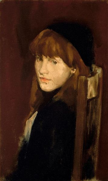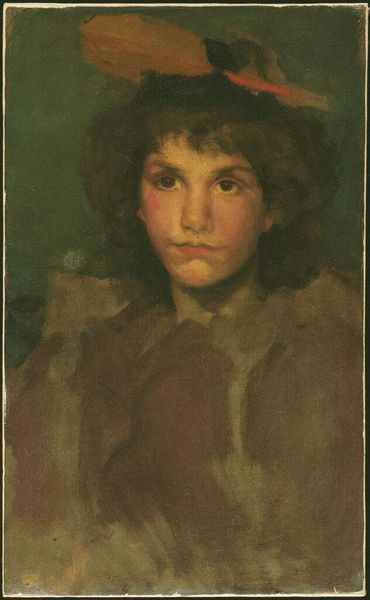 Curator: What strikes me immediately about this portrait, "Alice Butt," painted circa 1895 by James Abbott McNeill Whistler, is the thick application of oil paint and the warm, almost earthy color palette. It creates a certain mood. Editor: Indeed. There's an undeniable sense of melancholy here. Considering this was painted in the late 19th century, during a period of immense social and political upheaval, I wonder how Alice, the subject, navigated the burgeoning suffragette movement and Victorian ideals? Her downward gaze feels laden with unspoken narratives. Curator: It’s fascinating to consider that in relation to Whistler’s materials. He deliberately chose earth tones, working with the heavy texture of oil to almost obscure details. It’s not necessarily about perfect representation, but more about the emotional impact, right? What was the accessibility of oil paint for portraiture work at that time? Editor: Access certainly played a role. Commissions were crucial for artists like Whistler. Portraits provided not just income, but social capital. To what extent did gender dynamics shape these relationships of patronage? Also, the title is striking given that Victorian society’s public face often elided the everyday existence and names of models. It’s an open invitation, don’t you think, to consider who Alice Butt was? Curator: Perhaps. And what's also curious is Whistler's process – his tendency towards reduction, almost abstraction. The strokes are loose; they prioritize capturing an impression rather than precise likeness. This evokes conversation about what a portrait as a commodity really entails. What labor conditions surround portrait artists’ ability to even execute those works, particularly relative to their personal views of class or privilege? Editor: Right, this also gets into what it meant for a woman to be portrayed—displayed—within this social context. Was she allowed agency in the production of the work or the reception of her own image? Also, what did Whistler hope to convey about Alice beyond just her social standing? Curator: So it appears as though her very self is entangled with societal views and expectations surrounding women. Thinking materially then about the canvas and layers of applied pigment… all are subject to those same contextual demands! Editor: Exactly. Considering Alice's untold story through this lens allows for a richer, more empathetic understanding of the art and the historical period it reflects.