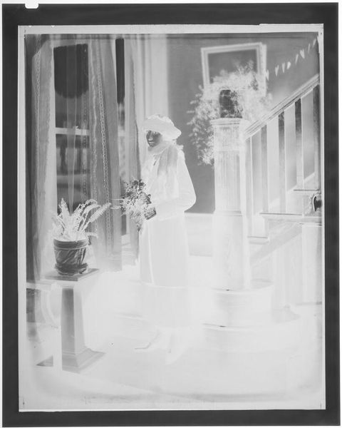 This photograph, by Paul Gittings, shows a woman with two children in a domestic setting, made through the traditional chemical process of film photography. The work's material directly influences its appearance. The stark contrast and tonal range inherent in black and white film captures a sense of formality and timelessness. It’s not just a snapshot, but a staged portrait, likely commissioned. Consider the material culture on display: the well-stocked bookshelf, the fashionable dress, the carefully arranged flowers. All speak to a certain level of affluence and cultivated taste. Photography, by its nature, is tied to wider social issues of representation, labor, and consumption. While the sitters here are the subject, the photographer's skill and equipment are equally essential to the image. The amount of work involved, from staging the shot to developing the negative, speaks to the value placed on portraiture as a marker of social status. By considering the materials, the making, and the context, we can understand the full meaning of the image, challenging traditional distinctions between fine art and everyday life.