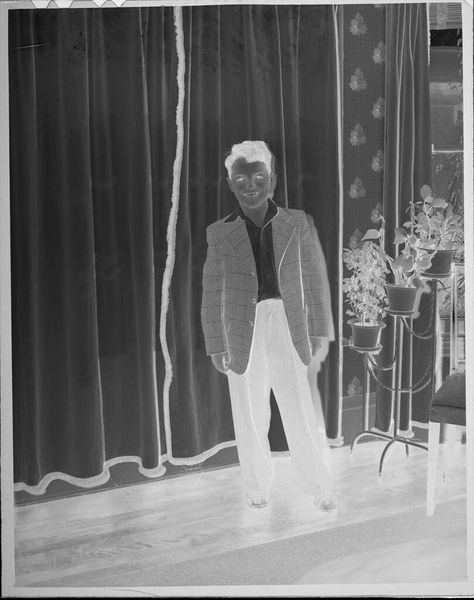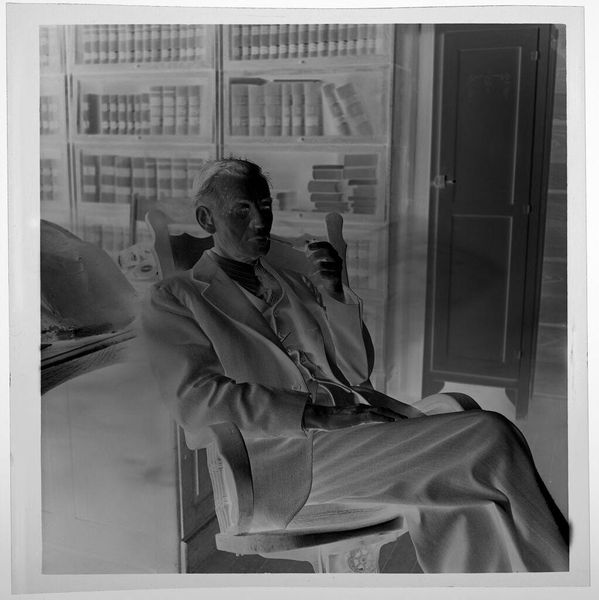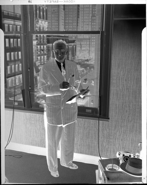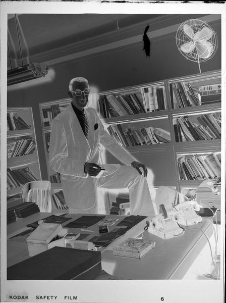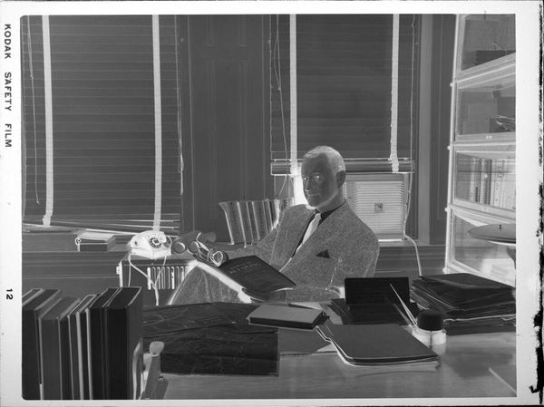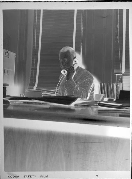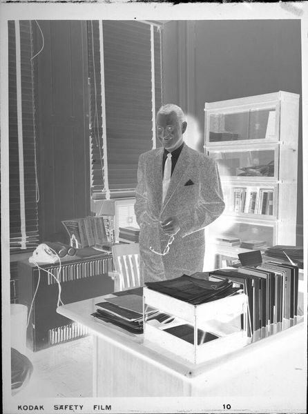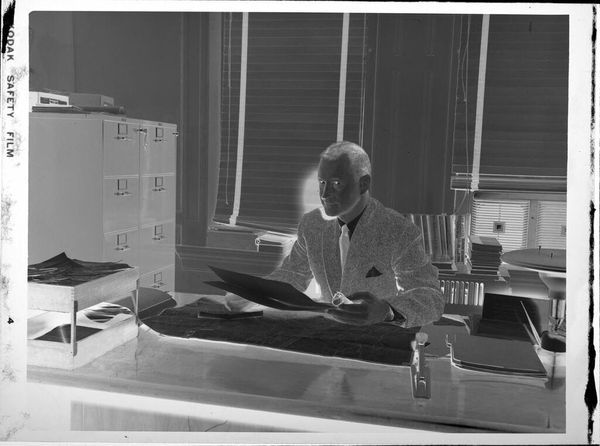 Curator: Here we see Peter James Studio’s photograph, “Untitled (man leaning on desk, reading),” held in the Harvard Art Museums. The dimensions are roughly 12.7 by 10.16 centimeters. Editor: The high contrast gives it an almost ghostly feel, stark lighting emphasizing the textures of his suit and the books behind him. Curator: This image evokes questions of power and knowledge. The man, presumably an academic, is situated amongst the tools of his trade, reinforcing a narrative of intellectual authority and the associated privileges of class and education. Editor: It’s also the labor of reading, the physicality of engaging with text. I’m wondering about the paper quality of the document he is holding and the printing techniques used. The material context of knowledge production itself interests me. Curator: Absolutely. And it's important to consider how this image, like all representations, contributes to the construction of those in power. It’s a visual encoding of privilege. Editor: Considering the composition and the angle, I wonder if the negative reversal brings forward questions about the material status of a photograph as an object. Curator: A powerful point. It brings a crucial layer to our understanding of historical context. Editor: Yes, it all connects. Thanks for guiding us through this!