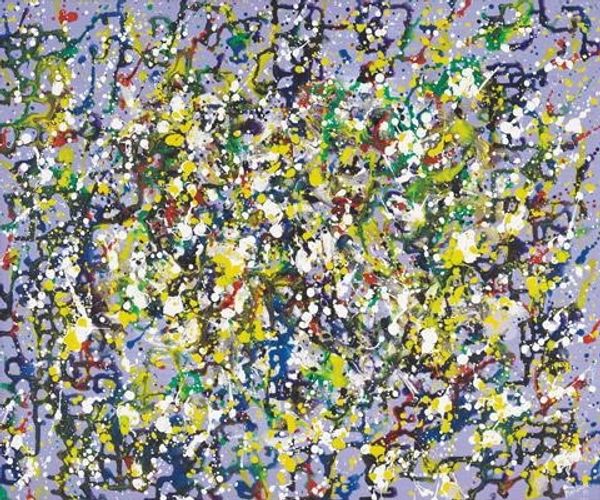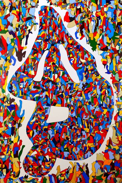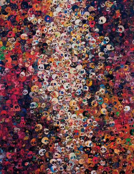 Editor: We're looking at Takashi Murakami's "A Fork in the Road," from 2020, crafted with acrylic paint. At first glance, it's a bit overwhelming, a riot of skulls vying for attention. What do you see in this piece? Curator: The compositional strategy is fascinating. Notice the relentless repetition of the skull motif. It creates a flattened picture plane, almost dissolving any sense of depth. Color, rather than line, defines the individual forms. How does the variation in color interact with this repetition, in your view? Editor: Well, it’s chaotic, but somehow contained. The colors are so bright, they almost mask the macabre subject matter. Do you think that contrast is intentional? Curator: Undoubtedly. Consider how Murakami deploys the vanitas theme through a hyper- Pop lens. The insistent flatness and seriality reject traditional notions of mimesis in favor of a system where form anticipates meaning, thus generating visual excess. Do you agree? Editor: Yes, I see what you mean. The excess kind of nullifies the darkness, making it almost playful, even though we’re confronted by death. I’d never have noticed that without your analysis of the colors and shapes creating that feeling. Curator: Precisely. By attending to these formal strategies, the painting gestures beyond simple symbolism. It pushes us to think about visual consumption and our relationship with symbols. Editor: It’s interesting how a piece that seems so immediate on the surface can hold so much complexity in its construction. I'm going to have to spend more time looking at this artist’s work! Curator: Indeed! Visual language allows us to read art from varying critical positions, constantly revealing fresh layers and nuances in their execution.