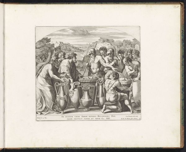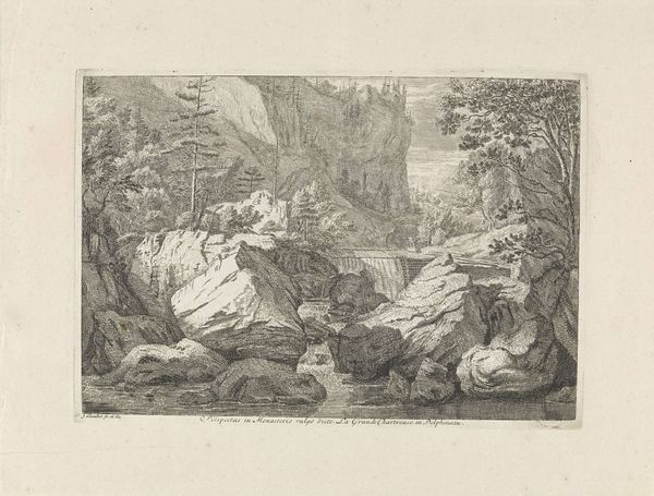 Curator: It's amazing how Nicolas Perelle managed to create such a lighthearted and pastoral scene using only engraved lines. This work, titled "Sater en nimf rustend bij een fontein tijdens de oogst," was created sometime between 1641 and 1695. The details here are just incredible. Editor: The scene immediately reads as staged and overtly allegorical. While the composition has a nice balance, it lacks a certain… earthiness, doesn't it? Everything feels meticulously placed. Curator: It’s an idealized vision of leisure, reflecting the era's values of refined beauty and symbolic storytelling. Notice the satyr with his wild hair, the sickle used for the harvest held by the nymph and the abundance around them – it's a celebration of nature's bounty through labour. The materiality of engraving further enhances the symbolic nature of labour and print making. Editor: Perhaps, but consider how the engraving itself dictates the experience. The stark contrast, the almost clinical rendering of light, it's less about celebrating labour and more about crafting an intricate pattern across the surface. The form and the structure are more relevant than the process and context of labor within Perelle's process. Curator: Yet, can we detach form entirely from production? The controlled lines suggest a specific process, labour is embedded within them. How long might it have taken to execute this engraving, and who had access to prints like these? These prints existed within the social context of distribution. Editor: That’s fair. But within that scope, focusing on how light models the figures and defines space seems crucial to understanding its artistry. See the subtle differences of linear depth of field across each form of matter? Curator: These forms would be non existent outside of the artists means. But the engraving style became more refined and streamlined at this time. And it mirrors labour-based movements across the land and into new means. Editor: An insightful approach. Thinking about it, these finer lines could equally suggest technical skill being celebrated at this period, while showing more than a depiction of daily life. Curator: Perhaps so. A synthesis between material production and refined presentation. Editor: Exactly. There are merits in approaching art through either lens, or preferably, in concert.