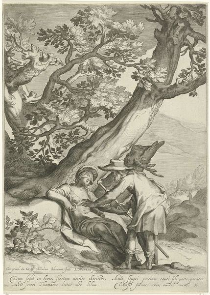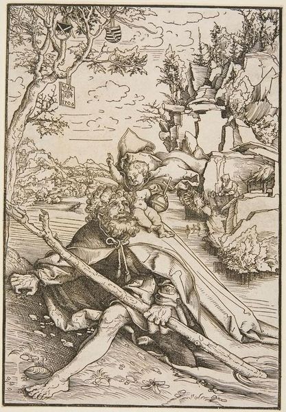 Curator: This is "Christ in the Garden" by Lucas Cranach the Elder. Editor: The stark contrast between light and shadow really amplifies the emotional tension. There’s a feeling of impending doom, almost theatrical in its staging. Curator: Yes, and look at how Cranach uses line to create depth and texture, typical of Northern Renaissance printmaking. The piece really captures the historical unease of the Reformation period. Editor: The chalice and the angels above Christ tell a story of sacrifice, but also divine support. It's a potent symbol of faith in times of adversity. Curator: The sleeping disciples add another layer, representing human weakness and the inability to fully grasp the spiritual struggle occurring. Editor: It's a study in contrasts; the divine versus the mortal, light against darkness, faith against doubt. So much meaning packed into a small print. Curator: Indeed, the image speaks to the anxieties of its time, and perhaps still resonates today.