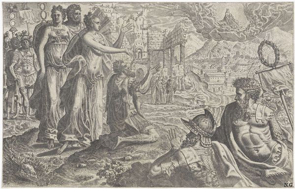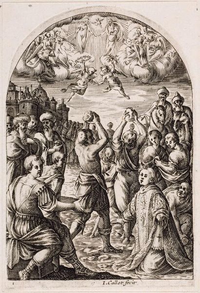 Curator: I find the detailed rendering in this print, "The Vision of Constantine," so striking. There's an anonymous quality to its production that allows us to consider the broader context of its making. Editor: It's overwhelming, visually! So much happening. I immediately think about power dynamics and the representation of faith in leadership. Curator: Indeed. The print’s linear quality suggests a matrix of labor, moving from the hand of the artist to the press and then distributed widely—each impression spreading its message. Editor: And what message is spread through the symbolism? Constantine’s vision, framed within Roman iconography, presents a powerful, divinely sanctioned ruler. What’s the relationship between these visual languages? Curator: We can examine how readily accessible the printed image would have been and trace where the paper may have been produced, who distributed the image, and consider the social classes that engaged with this work. Editor: Seeing it now makes me think about the ongoing debates around the role of religion in political decision-making today. Curator: Precisely. Analyzing production can reveal the image’s journey and impact on the socio-political sphere. Editor: Ultimately, it's a testament to the enduring power of images, regardless of their origins or the hands that created them.
