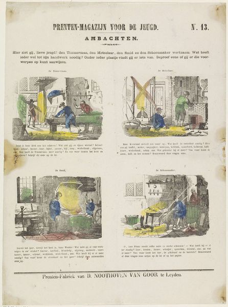 Editor: This print from somewhere between 1850 and 1881, by Dirk Noothoven van Goor, is titled "Pieter Nieuwland." It looks like it's made with graphic art techniques. There's a series of four little scenes and quite a bit of text, all within a larger rectangular print. What draws your eye when you look at it? Curator: Immediately, I'm drawn to the fact that this is a print, seemingly mass-produced. What was the function of such printed images during the late 19th century, especially with the explicit mention, as we can see, of being part of a magazine *for* youth. Were these purely didactic, instructional tools or did they serve another, perhaps even subtly propagandistic purpose in shaping young minds of the time? And who was Dirk Noothoven van Goor, and what kind of print-factory did he operate, producing such "magazines" for youth? Editor: I see your point. Thinking about mass production, how does this fit into, say, the history of printed images overall? Is it cheap production values, maybe, or something else? Curator: The image suggests the kind of production processes – inexpensive printing methods combined with simplistic, almost cartoonish figuration to appeal to a younger audience. It’s a business model. Did the accessibility and affordability of these images change the nature of art appreciation and the development of individual and collective tastes? Was visual literacy a tool for social mobility? Editor: So it's about more than just the image itself. It’s also about the means of production. Curator: Exactly. The print points to a moment in which artistic creation and labor were undergoing massive change through new technologies of reproduction. A cultural product that encapsulates historical shifts in industrial manufacturing processes as much as aesthetic intention. Editor: I see it so differently now, understanding it as a process, almost as a piece of material culture, not just an illustration.