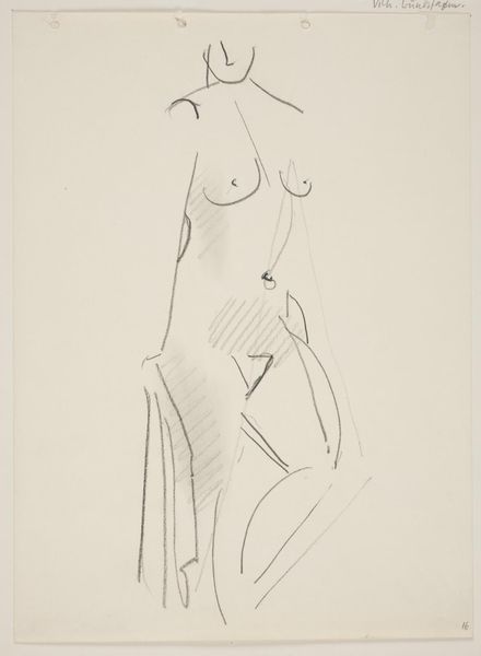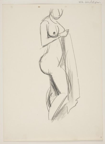 Editor: So, here we have "Standing Nude Woman, Profile to the Right, Drapery in Hand," a pencil drawing from 1949 by Vilhelm Lundstrom. It feels very… raw. Stripped down, almost brutally honest in its lines. What's your take? Curator: Raw, yes, like a freshly skinned thought, isn't it? Lundstrom is baring not just the body, but perhaps a certain psychological state. That drapery she clutches, is it comfort, concealment, a fragile attempt to maintain composure? Notice how the sharp, almost violent hatching defines form – there’s no gentle caress here, but a grappling with shape and shadow. He's really wrestling with form in its most primal essence. Do you sense any echoes of Cubism perhaps? Editor: I can see a hint of Cubism in the simplified planes and angles...but it also feels deeply personal, unlike the more objective approach of someone like Picasso. Curator: Exactly. It's as if Lundstrom internalized Cubist deconstruction, filtered it through his own intensely subjective lens. He's using the language of fragmentation not to analyze, but to express a very human vulnerability. And the missing face…it asks so many questions, doesn't it? Editor: Definitely. The lack of facial features is striking and it feels like the woman is being stripped of her individuality. Curator: Perhaps that stripping away *is* the point. He distills the figure to its elemental essence, amplifying the universal experience of feeling exposed, vulnerable, and questioning. Like peering into a mirror and not quite recognizing the reflection staring back. Editor: I see. So it's not just about the nude form, but about a kind of emotional nakedness, too. This has definitely changed my perspective on it! Curator: Wonderful! Art should always make us reconsider what we think we already know. A journey of rediscovery, wouldn't you agree?