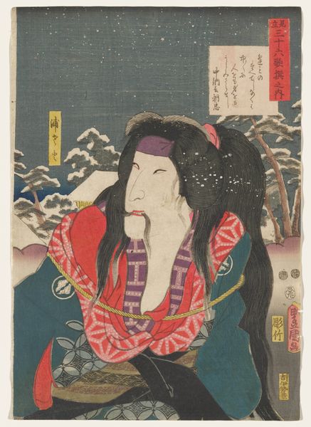 Curator: Allow me to introduce "Jiraiya en violen", a striking woodblock print crafted in 1862 by Utagawa Kunisada, now residing here at the Rijksmuseum. Editor: Immediately, I'm drawn to the almost graphic simplicity juxtaposed with the incredible detail in the robe patterns and the character’s expression. The flatness contributes a kind of immediacy; it's captivating. Curator: Indeed, that's characteristic of Ukiyo-e, a genre reflecting the ephemeral pleasures of urban life in Edo period Japan. Kunisada was a master of this form, particularly known for his actor portraits and depictions of popular tales. Editor: And in this case, he’s presenting us with Jiraiya, surrounded by these symbolic violins. Note how the colour choices, dominated by reds and blues, lend the piece a dramatic quality and serve to concentrate attention on the face. The face is wonderfully rendered, the subtle details really giving a sense of weight to the work. Curator: Precisely. Jiraiya himself is a legendary ninja, often associated with wealth and prosperity, suggested here by the pot overflowing with coins. The violins are integrated to the textual sections that were created within the design. One must also acknowledge the Art Nouveau feel the piece displays. The composition itself is a complex arrangement of linear elements and textured planes. The arrangement directs our attention to the subject's commanding presence and creates a visual depth that belies the print’s inherently flat nature. Editor: The Ukiyo-e prints, which were mass-produced, had an enormous influence, moving beyond the local culture, of contemporary art. You can really start to understand why when viewing prints like these and understanding how bold some of the designs are. The image hints at the tales that spread in Edo period Japan. Kunisada wasn't just documenting stories, but actively participating in constructing cultural icons. Curator: Yes, that's the brilliance of Kunisada—he doesn’t merely depict; he interprets and amplifies, leaving us with an image imbued with narrative richness and symbolic weight. Editor: Ultimately, beyond the story and its social roots, I appreciate how the formal interplay between the flat planes and intricate details produces such a striking visual statement.