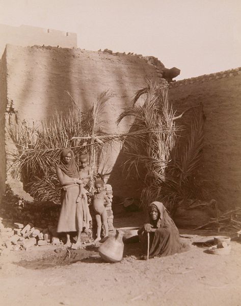 Editor: This gelatin silver print, "Twee onbekende mannen bij een waterpomp" by Félix Bonfils, dating from around 1867 to 1885, presents a quiet, almost staged scene. The figures, the pump, even the landscape seem carefully arranged. What do you see in this piece, considering it within the context of 19th-century photography and its relationship with Orientalism? Curator: It's a layered image. Bonfils, like many European photographers of the time, operated within a colonial gaze, framing the “Orient” for a Western audience. The staged quality you observe speaks to this – it's a constructed reality that reinforces pre-existing stereotypes. Editor: So, it’s less about objective documentation and more about fulfilling an expectation? Curator: Precisely. Think about the composition – the man at the pump presented as a worker, almost picturesque. How does this visual representation contribute to the broader discourse on labor, identity, and power within the context of colonialism? Also consider who might be the intended viewer? Editor: It almost feels exploitative now that you mention it. Like using these men and their labor as a backdrop for some kind of romantic fantasy. Curator: It is. It's essential to deconstruct these images and examine the power dynamics inherent in their creation and consumption. Understanding Bonfils' work involves acknowledging the colonial context and its lasting impact on how we perceive the Middle East and its people. What do you think you will take away from this particular reading? Editor: I now realize that photography, particularly from this era, requires a critical approach, acknowledging that it’s not just a reflection of reality, but also a product of specific socio-political perspectives and power structures. Curator: Exactly, and that is how we challenge those colonial narratives that continue to resonate today.
