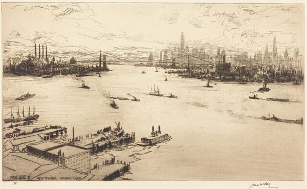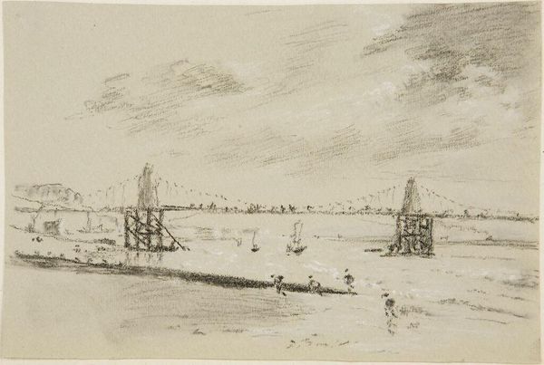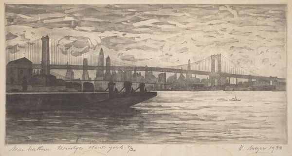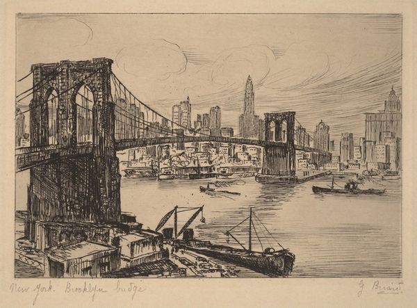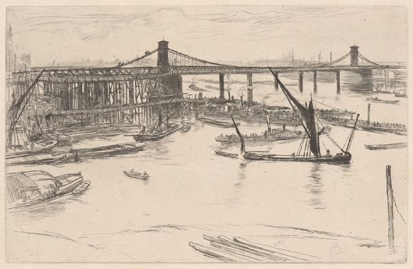 Curator: This is James Abbott McNeill Whistler's etching, "Old Hungerford Bridge," housed here at the Harvard Art Museums. Whistler, born in 1834, captures a moment of immense change in London's infrastructure. Editor: It's all misty atmosphere and skeletal architecture! The bridge feels like a caged beast, and those boats are ghosts gliding through the water. So evocative. Curator: Indeed. Whistler was fascinated with depicting modern industrialization. Hungerford Bridge, built in 1845, was part of that transformation—linking people and goods across the Thames. Editor: There's such a fragile beauty to it, though. All those delicate lines...almost like he's weaving a memory, not just documenting a structure. It's about the feeling of the city, not just the facts. Curator: Whistler was criticized for romanticizing industry. He faced many accusations that his art served no real social purpose. Editor: And I guess Whistler’s defense would be that it’s supposed to be felt, to create feeling. That's enough, isn't it? Curator: I think that's certainly what Whistler wanted us to think. Editor: Well, he succeeded, at least for me! What a ghostly masterpiece.