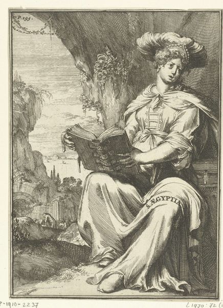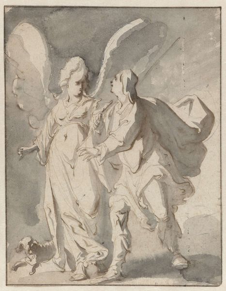 Curator: This is Elias van Nijmegen's "Historie," a drawing likely made sometime between 1677 and 1755. It employs watercolor and pencil on toned paper. What catches your eye first? Editor: There's a definite dynamism to it! The figure's pose and the flowing drapery create a sense of movement, but it’s tempered by what seems to be unfinished areas. It gives it the air of a working sketch rather than a highly polished piece. Curator: Absolutely. Considering Van Nijmegen's historical context, this allegorical approach aligns with the baroque sensibilities and the prevalent tradition of history painting. This depiction likely references Clio, the muse of history. Her image here connects the writing of history with divine inspiration and the classical world. Editor: Interesting. I see that now in the use of the quill and the column behind her. The paper and pigments he chose suggest a relatively accessible and mobile form of knowledge production. Was he making preliminary sketches, perhaps for a larger commission? Curator: Precisely! His technique reveals a fluidity that connects artistic practice to social and political forces that championed empirical observation. The Enlightenment was taking hold during this time. It challenged long-held, static beliefs and embraced human agency. The sketchbook nature of it is compelling. It acts as a document of knowledge formation, which feels radical. Editor: The materiality and portability make that clear. I keep noticing the small figure crouching in the lower right, almost hidden in the shadow. He looks almost like an imp. What might he signify? Curator: He's quite intriguing. Perhaps he's the embodiment of oral history and myth, always present and influencing formal narratives? Or possibly skepticism, or simply an acknowledgement of biased perspectives present when documenting. The muted palette softens the didactic edge a piece like this might possess. It creates a complex understanding of "history" that isn't just declarative. Editor: So the artist is inviting doubt and interpretation rather than presenting one reading? I do love those ambiguous figures in artworks. Thank you, I never thought about history as material that could be consumed, disseminated, carried! Curator: It reminds us that art is always situated in historical context and speaks to the forces shaping it.