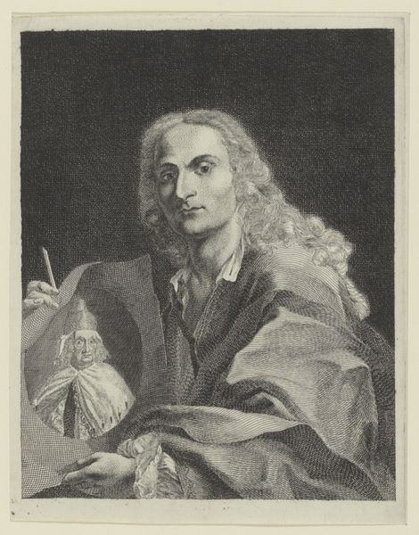 Curator: Here we have Jean Morin’s engraving of Antoine Vitre, royal typographer, dating roughly from 1605 to 1650. What strikes you about it? Editor: The details are exquisite. The etching masterfully captures a sense of weary wisdom in the subject's eyes. There is something both elegant and somber in his gaze, the subdued palette enhancing a quiet reflection. Curator: Considering his profession, I immediately look at how the tools of his trade are depicted. Note the clarity with which the burin and papers are rendered. This connects the portrait directly to Vitre's labor. Editor: Absolutely. But beyond that, who *was* Antoine Vitre? During a time of considerable religious and political upheaval in France, the power and control of printing presses by those associated with the royalty offer clues about production of knowledge and potentially suppression of dissident voices. What role did Vitre play within the broader framework of 17th-century French society? Curator: That's astute. Royal typographers controlled a crucial medium of disseminating information and consolidating power. Examining the paper used for such prints, and who consumed them, reveals much about class and literacy at the time. Editor: Exactly. His portrait, his gaze—they reflect more than just his personal story; they whisper about the socio-political narratives interwoven within his identity as the royal typographer during the Baroque era. The image is not merely representational but tells something important about how knowledge production happens. Curator: And the engraving technique itself adds another layer. It represents a reproducible image, a democratizing factor despite the controlling apparatus of royal production, wouldn't you agree? Editor: Up to a point. While engravings allowed for wider distribution, accessibility was likely still restricted. This portrait served a specific function within a carefully maintained social hierarchy. Curator: It makes one consider the engraver’s process as well, what does it mean to recreate an individual in print? We’ve talked about this artwork in the context of French royalty, production, class, identity—each perspective, as I reflect, seems crucial for a nuanced reading. Editor: Precisely. This work operates as an entry point, connecting personal identity with complex, historical structures.