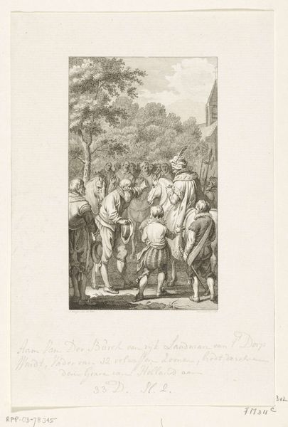 Ludwig Gottlieb Portman created this etching titled "Popilius bij Antiochus". The composition is immediately striking, dominated by two central figures set against a landscape rendered in delicate lines. Notice how Portman uses hatching and cross-hatching to model forms and create tonal variations, a technique that gives depth to the essentially linear medium of etching. The work gains meaning when you look at the interplay between form and content. The Roman senator Popilius Laenas is portrayed with a commanding gesture towards King Antiochus Epiphanes. The line drawn in the sand, and the expressions captured, suggests an ideological battle, a clash of civilizations where each is trying to assert their dominance in the scene. Consider the cultural context and Portman's mastery of etching to convey complex narratives through structured line work. This artwork then invites viewers to consider the relationship between form, content, and historical context within its aesthetic framework.