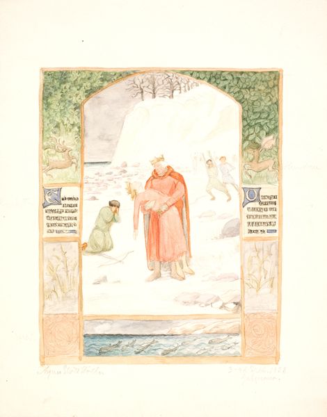Curator: Dmitri Zhilinsky's "Chernishev's Family," painted in 1970 using gouache, is quite striking. Editor: My first thought? Dreamlike. And almost…haunted? Everyone is there, but not really. Curator: That haunting quality, I think, comes from Zhilinsky's negotiation between Socialist Realism, the dominant style, and a more personal, psychologically nuanced vision. Consider how the family is posed within this liminal space, neither fully present nor entirely absent. There are undertones here questioning conventional portrayals of Soviet life. Editor: Exactly! It's like looking at a stage play where the actors forgot their lines. Are we witnessing a critique of the ideal family construct of the time, and more subtly, what happens if they begin to disappear or become displaced. I can almost feel that collective disquiet resonating! The color choices only deepen this odd feeling of unreality, particularly their milky skin tones set against the russet of a woodland scene. Curator: The stylized nature and flattened perspective certainly depart from the idealized portrayals expected of artists during this era. Also, think about how this was happening within the context of Soviet Nonconformist Art. What statements might the artist have been trying to make? Editor: Absolutely. Perhaps it asks questions, subtle as they are, about reality itself—how the facade can crumble and reveal a hidden underbelly that is both poignant and disquieting. This isn't merely a family portrait; it is more like a coded dispatch from a world teetering on the edge. And perhaps there's an element of remembering, too, a yearning for simpler times. A child can even be spotted in the background of the portrait, mid-leap and suspended in motion. It feels a bit ghostly... Curator: In examining Zhilinsky’s body of work, one discovers he routinely questions societal structures using techniques like these to inject symbolism into everyday themes. It's a clever strategy and brave when contextualized within the dominant art style that this era demanded from its artists. Editor: So, yeah, "Chernishev's Family"... initially dreamlike, ultimately a complex story layered into paint. It's more than just seeing, it's feeling a pulse under the image itself. Curator: Precisely—it exemplifies the strength in art that doesn't just reflect society, but thoughtfully interrogates it.