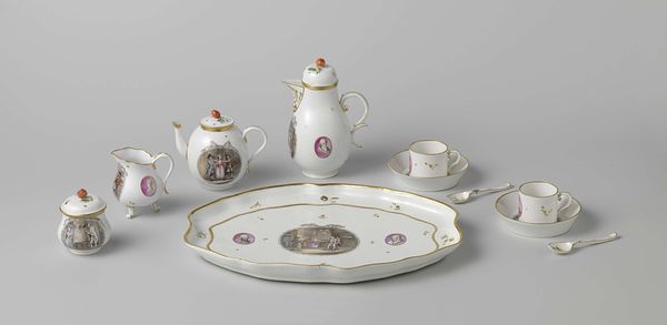 This is a porcelain tea set, delicately painted with pastoral scenes, crafted by the Koninklijke Porseleinfabriek Dommer & Co. At first glance, it's easy to see the tea set as a charming depiction of rural life. But remember, representations of the countryside have often served as idealized projections of social harmony, masking the realities of labor and class division. The act of drinking tea, often associated with refinement and leisure, became deeply intertwined with global power dynamics and colonial trade. Think about the historical context. The landscapes on the tea set might evoke a sense of calm, but for whom was this tranquility intended? How did the production of porcelain, and the rituals surrounding tea, contribute to larger social structures? Who were the consumers of these refined goods, and what was their relationship to the scenes depicted? Consider how this seemingly innocent tea set reflects broader societal issues, while also offering a glimpse into the intimate and personal moments of those who gathered around it.