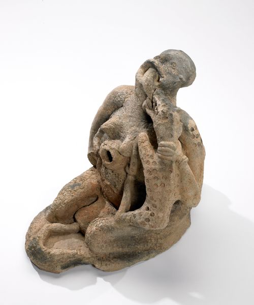 Curator: This arresting sculpture is entitled "Les premiers pas", which translates to "The First Steps." Attributed to Eugène Lacomblé, the terracotta piece likely originates from somewhere between 1800 and 1950. Editor: Immediately, the raw, unpolished quality of the terracotta speaks to me. You can almost feel the artist’s hands shaping the material, coaxing form out of the earth. It evokes something deeply human. Curator: Indeed. Observe how Lacomblé uses simple, almost crude, modeling techniques to capture the intimate moment of a mother guiding her child's first steps. There's a strong vertical thrust balanced by the mother's bowed posture. The lines, though simplified, are nonetheless powerful. Editor: The apparent lack of refinement interests me, however. Considering its dating, what was the socioeconomic context for working in such a raw way, directly with terracotta? Was it a deliberate aesthetic choice against the prevailing polished styles, perhaps reflecting a new engagement with working class experience? Curator: An insightful consideration! One can appreciate the overall composition as an exercise in contrasting forms: the smooth surfaces of the child versus the textured robes of the mother, further emphasized through differential handling of light across the work. Notice, for example, the dramatic chiaroscuro where the mother’s arm reaches toward the child. Editor: Exactly. It's about the labour, isn't it? This feels like a meditation on physical support, both in the immediate parental sense, and perhaps a wider consideration of material support and its presence and absence. What did accessing the material, then moulding it like this, communicate? Curator: You highlight interesting considerations. While material circumstances likely contributed to this treatment, the visual outcome speaks of tenderness and profound emotional awareness. Ultimately, it achieves a poignant image of nascent capability—and the nurturing that makes it possible. Editor: Agreed. I appreciate how examining the raw, elemental qualities leads us toward a richer appreciation of the tender scene it depicts.