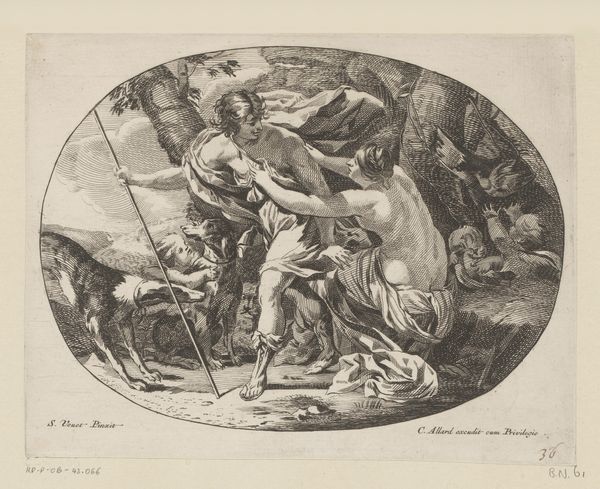 Editor: This is "The Entombment of Christ," an engraving from 1671 by Gilles Rousselet, residing in the Rijksmuseum. There’s a starkness to it, the way the bodies are rendered in such detail against the somber background creates a very poignant mood. What symbols stand out to you in this work? Curator: Well, consider first the very act of entombment. It signifies not just death, but transition, a threshold. In many cultures, burial rituals are deeply symbolic, representing hope, remembrance, or a continued connection to the departed. Do you notice the rope the figure on the right carries? Editor: I do! It looks worn. It gives me a sense of urgency, even though they seem so deliberate. Curator: Exactly! This points to a specific moment in Christian narrative. This act carries centuries of cultural weight; here it suggests burden, shared grief, and a community undertaking. Think about the posture of the figures, the careful handling of Christ's body… what do they tell you? Editor: They all look mournful, with their bowed heads. But there is this strong sense of care, of almost reverent tenderness in the way they hold his body, and it brings me back to thinking about how important the simple action of burying a person can be to the living. Curator: Precisely. This image reminds us that certain rituals remain powerful across centuries. It's the act of communal mourning and remembrance, rendered visible through potent symbolism and masterful engraving. Editor: This has shifted my thinking about the cultural weight that an engraving can hold!