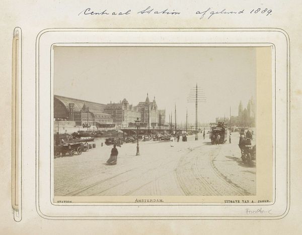 Editor: This gelatin silver print, titled "Mensen op het station van Urbach," dating from around 1895 to 1905, has such a stillness to it, almost ghostly. What do you see in this piece that maybe isn't immediately apparent? Curator: The station, often a threshold for various journeys and social strata, operates here as a compelling site to unpack early transportation networks and social mobility, right? Observe the blurry figures; they appear suspended, anonymous, each on their own separate mission, possibly migrants or locals alike, navigating a quickly modernizing world. Editor: That’s a great point about mobility and modernity. Curator: How does the photographer seem to address the increasing social stratification during the German Empire at the end of the 19th century, though this new ease of access through rail travel? Do you see certain people, maybe the man walking alone, carrying with him the tension of social transition and economic inequality? Consider how different people utilized and encountered technology. What is visible in this image of everyday life, and perhaps more so, what's invisible? Editor: So you're saying that a seemingly simple cityscape photography is a mirror reflecting those tensions and silent divisions? Curator: Precisely. Photography itself was democratizing in many ways but was also expensive. Someone made the aesthetic and conscious decision to capture a particular class narrative within these developing train routes, suggesting that technology also amplifies underlying social patterns. I appreciate this image's subtle yet potent suggestion of change. Editor: That’s fascinating. I'll definitely look at similar photos with fresh eyes now, thinking about who is visible and who is not.