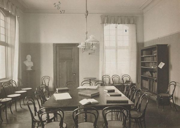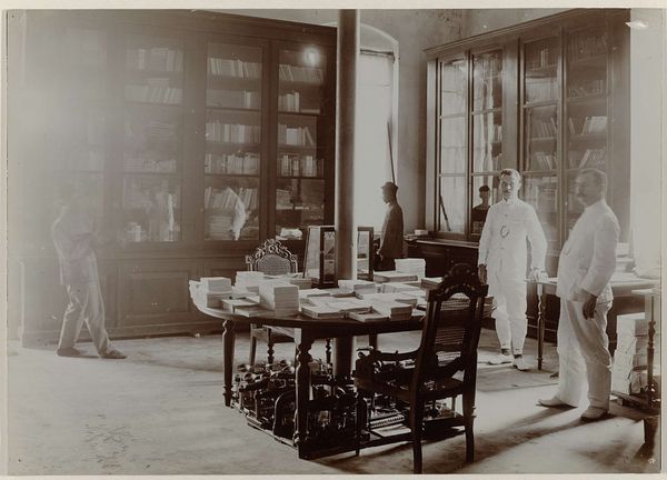 Editor: Here we have "Administratie van de Drukkerij", taken in 1921, a gelatin silver print by T. Kaneo. I'm struck by how quiet it feels, even though it depicts a busy workplace. What do you see in this piece? Curator: It's a compelling document, isn't it? I see a study of power, really. Think about it: photography was still developing its role in society then, particularly in documenting labor. Kaneo captures this administration with a seemingly neutral eye, yet the very act of photographing, of archiving this scene, speaks to a certain societal structure and control. Who commissioned this photograph and why? Editor: That's an interesting perspective! I was so focused on the quiet humanness of it all, but I see what you mean. The composition, with the desks lined up and workers in similar positions, almost feels like an organizational chart made visual. Curator: Exactly! And consider the light, too. It streams in, illuminating the space, but also perhaps revealing the controlled, ordered nature of the workplace. Photography had immense power in constructing and reinforcing the ideals of that period. How do you think this image might have been received by different audiences back then? Was it meant to be viewed at all by the people in it? Editor: I hadn't even considered that it might not have been! If it was just for internal purposes, it would be documenting procedure and progress. Perhaps meant to assure someone about the running of the printery. Curator: And what if this was circulated? Imagine the statement it would make regarding the colonial infrastructure in that time, depending who was in the imagined or targetted audience. Editor: This has made me rethink how something that appears like just a still slice of life actually carries a complex story about power, perspective and context. I'll never see photographs the same way! Curator: That’s the beauty of looking at art through a historical lens. It forces us to question what we think we know, to see beyond the surface and recognize the social and political forces at play.