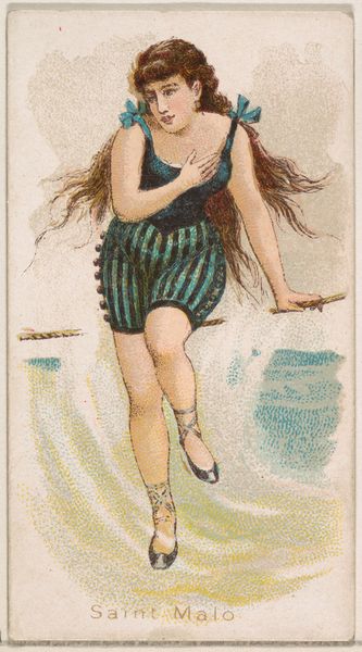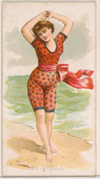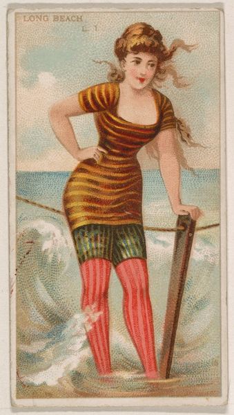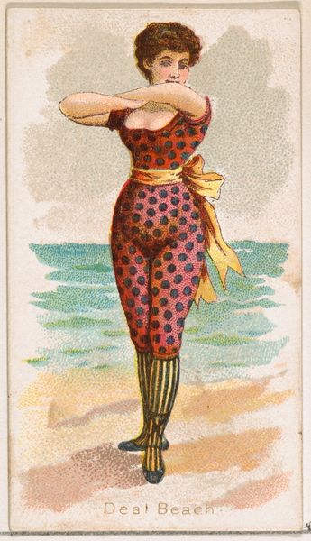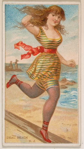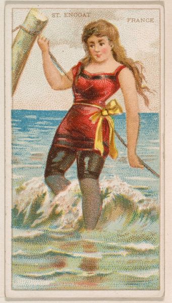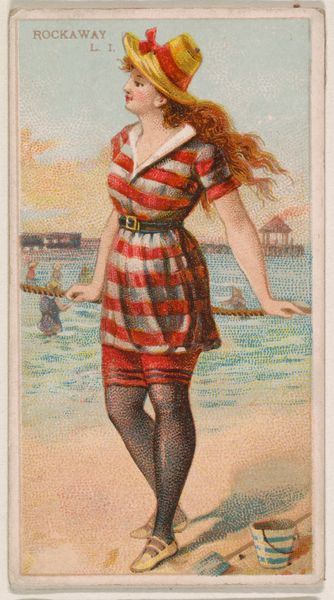 This chromolithograph, titled "Sea Girt, New Jersey," was produced by the Kinney Brothers Tobacco Company as part of their "Surf Beauties" series. The process of chromolithography was revolutionary for its time, allowing for mass production of color images. Look closely, and you'll notice the image is created from many tiny dots of color. This technique, while now commonplace, demanded skilled labor in its initial execution, with artisans meticulously layering colors to achieve the desired effect. Here, we see a woman in a red bathing suit wading in the ocean, rendered with a level of detail that would have been impressive for a mass-produced item. The material of the print itself, humble paper, belies the complex process used to create the image, a process directly tied to the rise of consumer culture and the industrialization of image-making. Considering "Sea Girt, New Jersey" through the lens of its making allows us to reflect on the broader social and economic forces that shaped its creation and consumption.