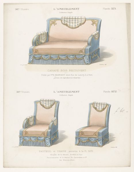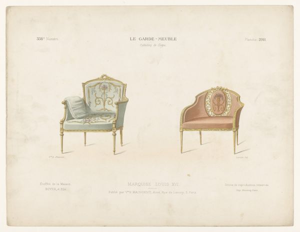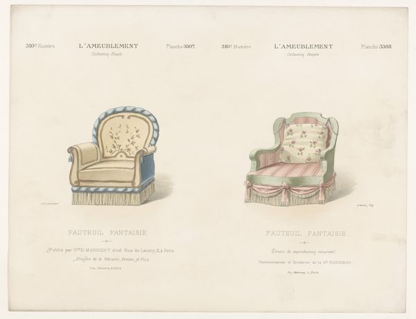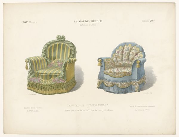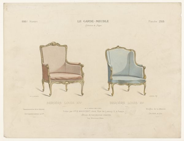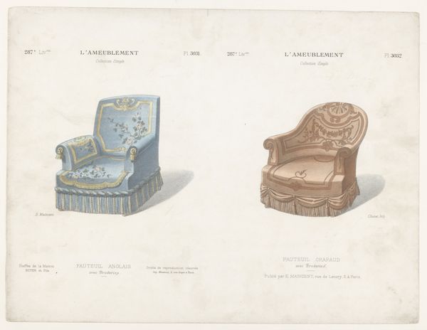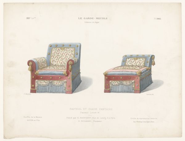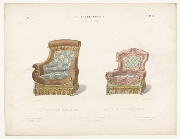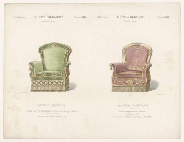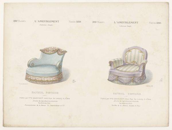 Léon Laroche's "Twee fauteuils" presents two distinct armchair designs, rendered with delicate precision. The composition, bisected vertically, showcases two variations on domestic comfort. On the left, a golden chair with blue accents exudes a playful charm, its shape adorned with whimsical flourishes and a decorative fringe, hinting at lightness and movement. The chair on the right, in contrast, offers a more somber, muted palette of pinks and grays; its structure appears more contained, suggesting a sense of formality and restraint. This duality invites us to consider how design embodies deeper cultural codes. The contrasts in color, shape, and decorative elements reveal a playful dialogue between functionality and aesthetics. The armchair on the right seems to whisper of tradition, whilst the left design suggests a desire to break away from established norms. As we reflect on Laroche’s drawings, consider how such objects reflect and shape our perceptions of comfort and style. Here, the armchair is not merely a seat, but a signifier of evolving social values.