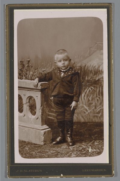Idanus Hendrikus Slaterus created this small portrait of an unknown boy, capturing a moment in time with the photographic techniques of his era. Slaterus, who lived through a period of vast social change, shows us a glimpse into the life of a young boy, likely from the Dutch middle class. The boy stands in a suit with a serious expression and fashionable boots. The conventions of portraiture at the time tended to favor posed, formal settings, yet there's something about the boy’s gaze that feels both vulnerable and defiant. The image offers insight into the construction of childhood and class identity in the late 19th century. As we consider the context, we might ask ourselves: What expectations were placed on this young boy as he grew into manhood? What hopes did his family have for him? This photograph encapsulates the intersection of personal identity and broader societal norms.