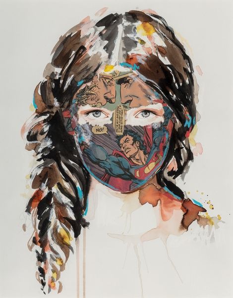 Editor: Sandra Chevrier’s mixed-media piece from 2015, "Immune to Her Charms," presents a stunning portrait where a woman's face is overlaid with fragmented comic book imagery. There’s almost a haunting quality to it, like a beautiful mask concealing something more complex. What do you make of this combination? Curator: You know, when I look at Chevrier’s work, I feel like she's handing us a looking glass into the modern female experience. The watercolor portrait itself has such delicate vulnerability, doesn't it? But then BAM! Those fierce, dynamic comic book fragments disrupt that traditional beauty. Editor: Exactly! The contrast is striking. It's like a battle. Curator: It is. Perhaps Chevrier is playing with the idea of the superhero persona—this outwardly strong image that women often feel pressured to maintain—versus the sensitive soul underneath. It makes me wonder, what are we really seeing? Strength? Vulnerability? Or something in between? And what does it mean to be "immune to her charms," is this some kind of personal motto? I just adore the narrative ambiguity. Editor: So, is she suggesting that there’s a hidden strength *because* of the vulnerability, not in spite of it? Like the comic book shards are layers of armor and emotion? Curator: Precisely! It makes one contemplate that delicate balance of interiority, the stories we carry within ourselves. These fragments could also stand as societal expectations. They become almost like a sort of fractured mirror reflecting those external pressures back. Editor: I love how this piece takes something familiar—superhero comics—and twists it into a deeply personal and reflective statement about womanhood. Curator: Yes, it's a reminder that even behind the strongest facades, there are stories unfolding, vulnerabilities simmering, and hidden battles raging.
