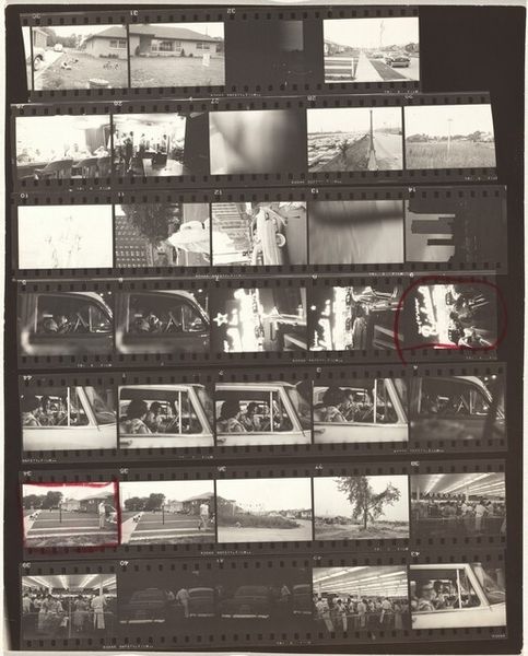 Robert Frank created this gelatin silver print, "Guggenheim 303--Tennessee," by arranging strips of 35mm film into a grid. The high contrast and grainy texture of the black and white images create a sense of immediacy. Frank’s work is celebrated for its raw, snapshot-like aesthetic. These qualities challenged the conventional norms of documentary photography. The filmstrip format invites us to consider the sequencing and juxtaposition of images. The arrangement isn’t arbitrary; it’s a deliberate construction designed to evoke a sense of place. The images cover everyday scenes: buses, buildings, gatherings of people. Circles drawn over some of the images highlight, and isolate them, drawing our eyes to particular images, perhaps suggesting hidden connections or meanings. Frank’s method reflects the semiotic idea that meaning is constructed through relationships. The film strip challenges the notion of photography as objective truth. The organization of the images in "Guggenheim 303--Tennessee" becomes a statement about how we perceive and construct reality through fragmented and subjective viewpoints.