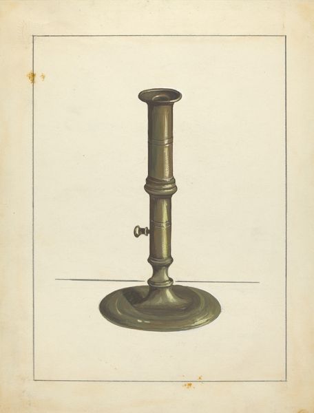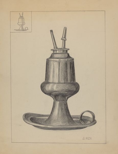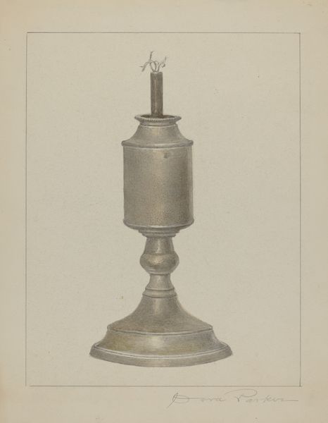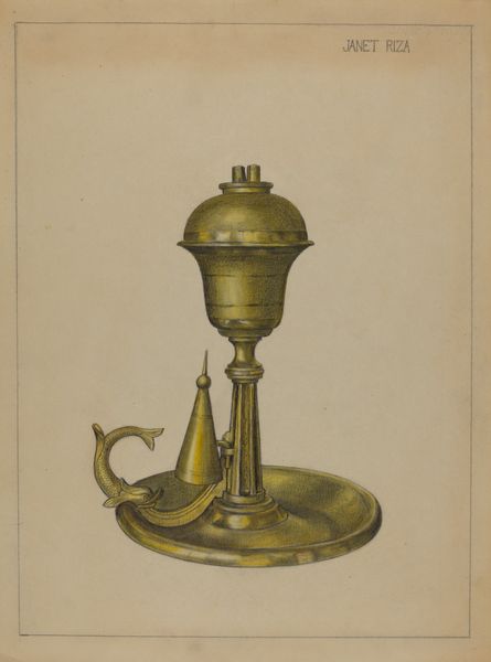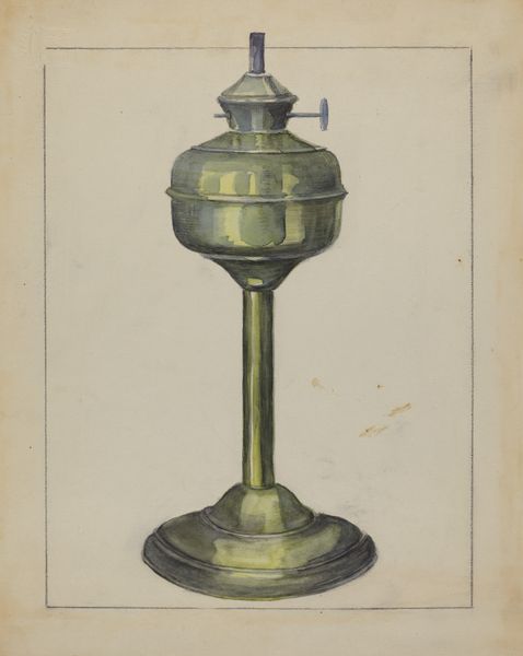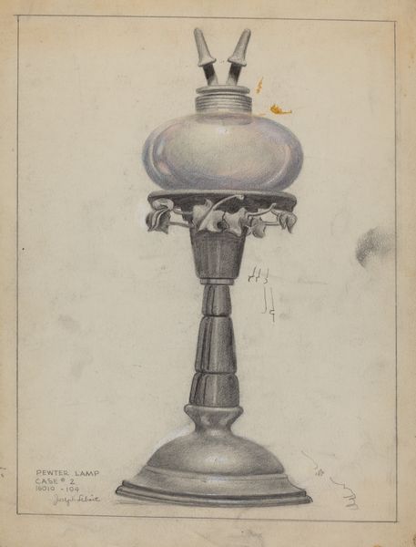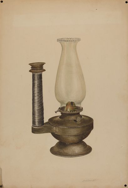 Herman Bader made this drawing of a camphene lamp with graphite and colored pencil. The lamp is a utilitarian object. The drawing gives us a glimpse into the material culture of a particular time. Before electric light became widespread, devices like this lamp were essential for everyday life, dictating the rhythms of work and leisure. When was this made? The manufacture and use of camphene lamps peaked in the United States during the mid-19th century, making them important to the economic and social history of this period. Camphene itself, derived from turpentine, was a cheaper alternative to whale oil, though known for its pungent smell and dangerous flammability. The lamp is also an object invested in a history of design. The drawing shows its construction with a keen eye. The drawing is a valuable record of technology. By consulting period trade catalogs, patent records, and household inventories, we can learn more about the social and cultural role of the camphene lamp, and of Herman Bader’s place in the story of its design.