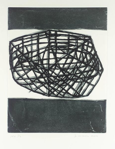 Editor: This print by Terry Winters presents a woven form floating between textured bands. It feels almost like a diagram of something organic, yet contained. How do you interpret this work? Curator: It's funny, isn't it? The linear precision clashes with the suggestion of something biological, something unruly. I feel like Winters is showing us the tension between structure and chaos. Editor: So, not just one or the other, but the interplay between them? Curator: Exactly. Does that resonate with you at all? Editor: Definitely, it does make you think about the world in a new way. Curator: It does. And art should always give us something to ponder.
