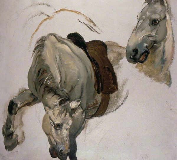 Editor: Here we have John Singer Sargent’s "Saddle Horse, Palestine," created in 1905. It looks like a watercolor piece and, honestly, it feels a little unfinished. I’m intrigued by the almost abstract way he captures the horse. What stands out to you in this painting? Curator: I am particularly drawn to the artist's choice of watercolor here. It emphasizes the immediacy of the encounter – perhaps suggesting the fleeting availability of leisure time and disposable income allowing Sargent, part of the leisure class, to dabble in plein-air work while traveling. Think about how the accessibility of paint materials impacts who gets to create art, and what subjects they deem worthy. Editor: That's a perspective I hadn't considered! So, it's not just about the aesthetic, but about the socio-economic conditions that allow for its creation? The act of painting is itself tied to a system? Curator: Precisely. Consider the production of watercolor paints at that time. Who were the laborers involved? What kind of pigments were being used and where were they sourced? The history of the British Empire is intricately tied to the exploitation of raw materials for luxury goods enjoyed in Europe. How might this painting subtly reflect those power dynamics? Editor: So, even a seemingly simple watercolor of a horse can be a window into larger social and economic structures. Curator: Absolutely. It challenges the conventional view of art as solely an aesthetic creation, redirecting our focus to the processes, materials, and social context that underpin its production. We often forget that leisure, like Sargent’s ability to travel and paint, is often built upon someone else’s labor. Editor: This has completely changed how I see the painting. Thanks so much! Curator: My pleasure!