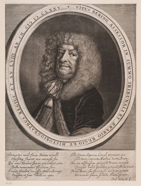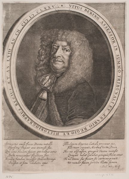 Isaac Ledeboer created this portrait of Ernst Jan Ledeboer using engraving techniques, capturing a sense of composed dignity. The oval frame, inscribed with the sitter's name, immediately directs our focus to the figure within. Ledeboer's mastery of line is evident in the detailed rendering of textures. Notice how the lines create a sense of depth, particularly in the drapery and the subject's hair. The contrasting light and shadow further enhance the three-dimensionality of the form, pulling the figure forward. The composition is structured around balance, with the subject centrally located, yet there is a slight asymmetry in the gaze and hand gesture. This asymmetry introduces a dynamic quality, preventing the portrait from feeling static. The inclusion of the inscription below adds another layer, merging visual and textual elements in a manner typical of the period. It invites us to consider the artwork's role in constructing and conveying meaning, through both image and text.