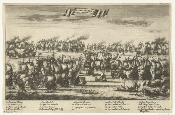 Bastiaen Stopendael created this print titled "Zeeslag bij Agosta, 1676," using etching. The composition of the print is dominated by a dense arrangement of ships engaged in battle. These intricate forms are meticulously detailed, creating a rich texture across the plane. The contrast between light and shadow further accentuates the drama of the naval conflict, highlighting the dynamic interplay between the vessels and the surrounding smoke. Here, Stopendael captures the essence of maritime warfare by emphasizing the geometric precision of the vessels against the fluid chaos of battle. The print acts as a semiotic system, translating the historical event into a structured visual narrative. The precise lines and calculated arrangement of elements invites us to consider the strategies and technologies of naval warfare of the time. The use of printmaking techniques here doesn't merely reproduce an image, but constructs a complex representation that conveys the magnitude and intensity of the naval engagement.