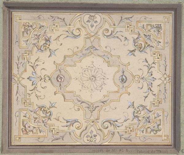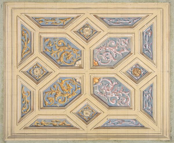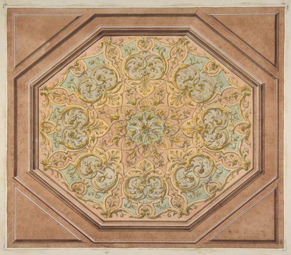 Jules-Edmond-Charles Lachaise made this design for a pentagonal ceiling using graphite, watercolor, and gouache. The drawing presents a symmetrical layout of geometric forms and stylized floral patterns. Lachaise, born in France at the end of the 19th century, was working in a period defined by rapid industrialization and profound social changes. The design reflects the cultural interest in symmetry and order, prevalent in interior design during that time. The geometric patterns and the precise rendering suggest a desire for structure and harmony, typical of early 20th century aesthetic ideals. However, the emotional and personal aspects of interior design can be complex, especially when considering the social implications of domestic spaces. Spaces like these reflect the cultural values of order and beauty, but they also represent a subtle assertion of identity and status. They are both personal sanctuaries and stages for social performance.