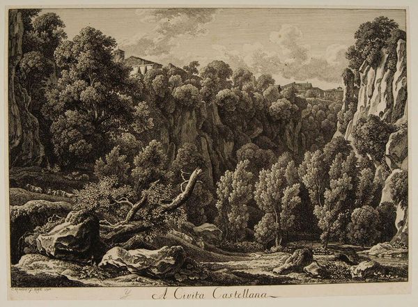 Editor: Here we have Jacob Wilhelm Mechau's "A Civita Castellana," an etching. It’s quite detailed! What strikes me is the contrast between the wild, overgrown landscape and the ruined structure. What do you see in this piece? Curator: Notice the labor involved in creating this image: the intensive work of etching. Consider the social context: prints like these democratized access to landscapes, previously only available to the elite through painting. How does the materiality of the print shape our understanding of landscape and ownership? Editor: So, the print-making process itself is part of the artwork's meaning, making landscapes more accessible. I never thought of it that way! Curator: Exactly. The medium is the message, reflecting shifts in production and consumption during that era.