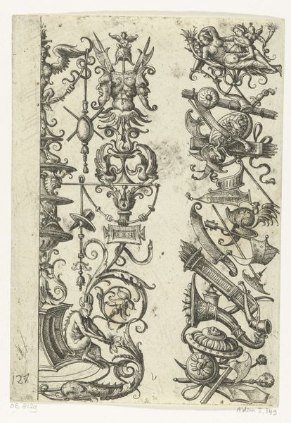 This print, titled "Ornament met uil en andere vogels," was made by an anonymous artist using etching. Etching is an intricate process. First, the artist covers a metal plate with a waxy, acid-resistant layer. They then draw their design, removing the wax and exposing the metal beneath. When acid is applied, it bites into these exposed lines, creating grooves. The deeper the bite, the more ink the groove will hold. The plate is then inked, wiped clean, and pressed onto paper, transferring the design. The material properties of the metal plate, the acid, and the artist's skill all contribute to the final image. The sharp, precise lines are a hallmark of the etching process, giving the print a crisp, detailed quality, which in this case is a fantastical array of foliage and birds. This kind of print was very popular as a model for other artisans to copy. Understanding the labor-intensive process of etching gives us a deeper appreciation for the artistry and skill involved, challenging the traditional hierarchy between fine art and craft.