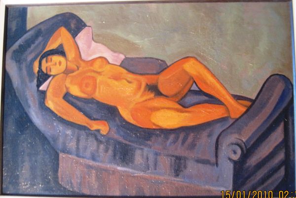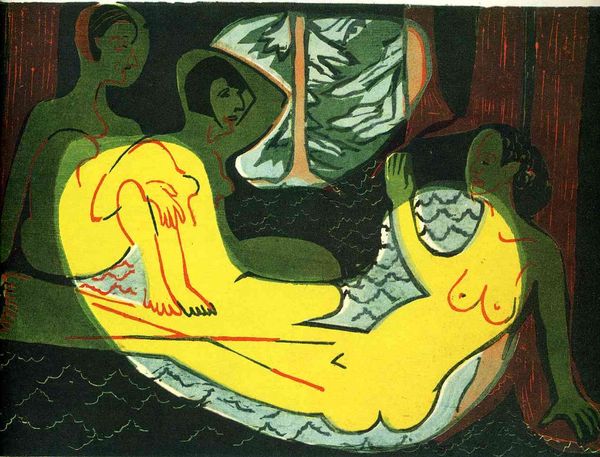 Editor: So, this is Jean Metzinger’s “Nu Couché (Reclining Figure),” painted in 1946, using oil on canvas. It's quite striking – the fragmented form and the bold use of colour give it a very modern feel. What catches your eye about it? Curator: Well, beyond the surface appearance, it’s crucial to consider the material conditions that produced this image. The rationing of materials during and after the Second World War undoubtedly impacted the availability and quality of pigments and canvas. Do you see how this might influence the painting's perceived aesthetic? Editor: That’s interesting, I hadn’t considered the impact of material shortages. Did Metzinger have to adjust his techniques or colour palette because of those limitations? Curator: Exactly! The somewhat muted, earthy tones might not solely be a stylistic choice. Think about the labour involved too; did Metzinger, in post-war France, prepare his own canvas or rely on others? The division of labour impacts the artwork’s aura. What do you think the introduction of new synthetic pigments around this time might have meant for artists? Editor: Possibly greater colour intensity, but maybe also concerns about longevity and the aging of the paints? Also, could mass production make paints accessible to a wider range of artists? Curator: Precisely. This painting exists within a specific economic and social context, shaped by the availability and accessibility of materials, the labor practices involved, and the expanding art market. Notice the recurring theme of "elle", is it a nod to the feminine labour in textile production or consumer culture at the time? Editor: That's fascinating, how focusing on the materiality and production really changes how I perceive the artwork. It's not just about the image, but also about the tangible reality behind its creation. Curator: Indeed. Considering the raw materials and production process, this gives us a richer understanding than purely focusing on stylistic labels such as "modernism" or "fauvism". I have learned something new from that analysis myself, thank you.